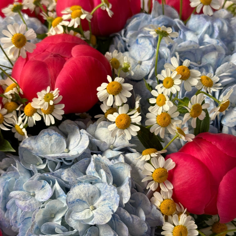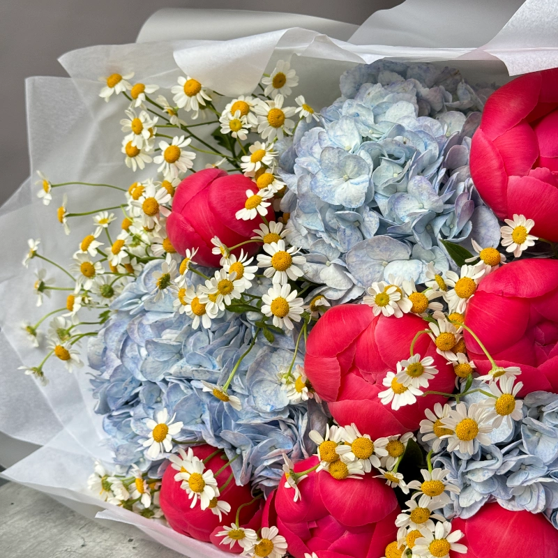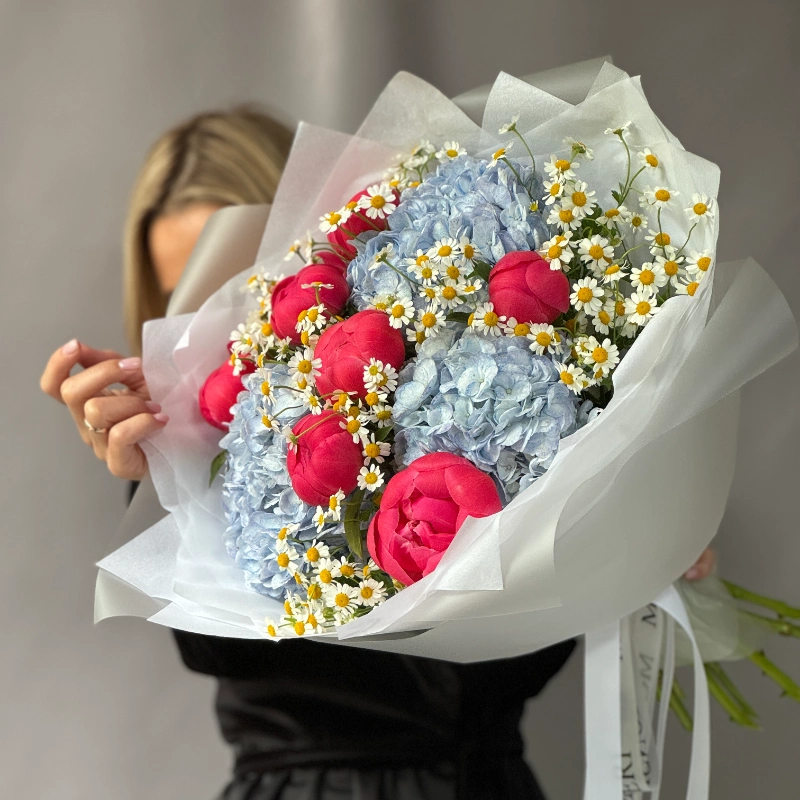 Воздушный букет с пионами Корал Шарм, голубой гортензией и голландской ромашкой - Тренд этого сезона 🔥🔥🔥