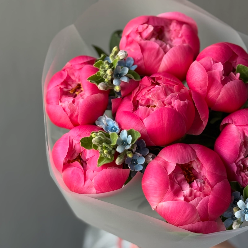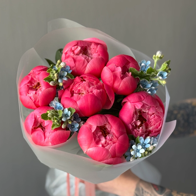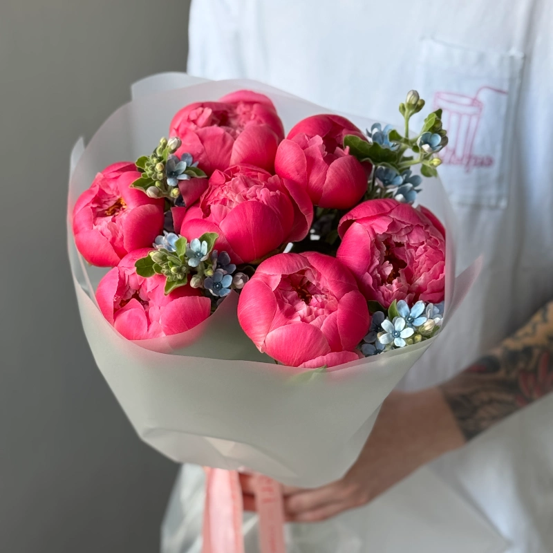 ГлавнаяКаталогБукетыПионы Корал Шарм 7 и оксипеталлум