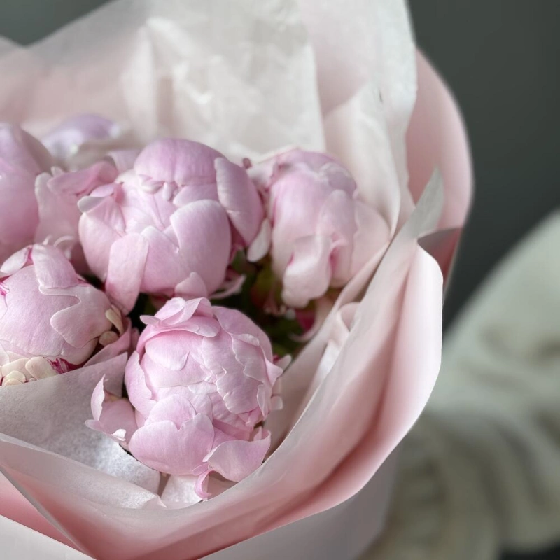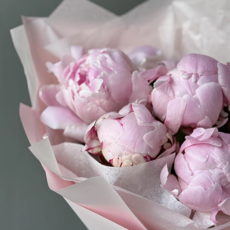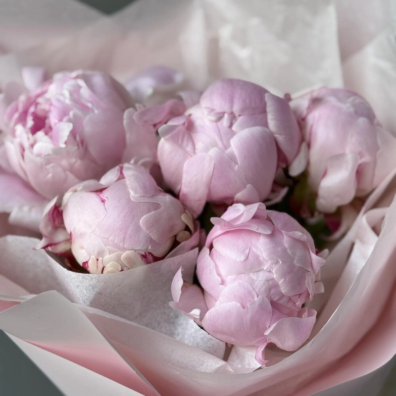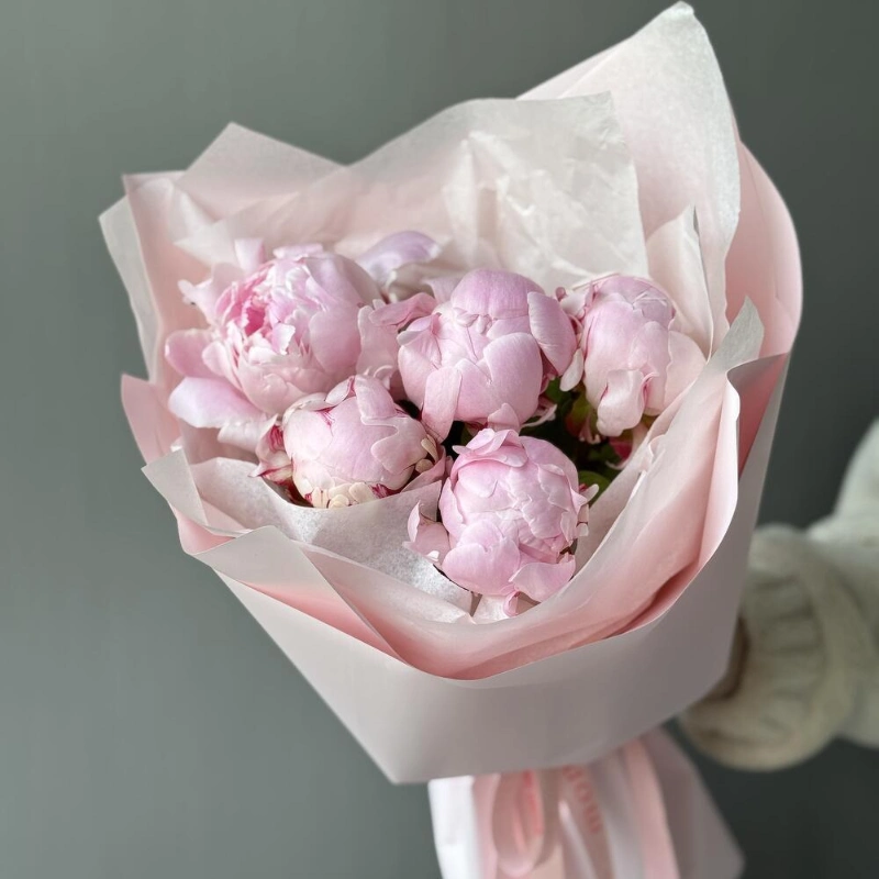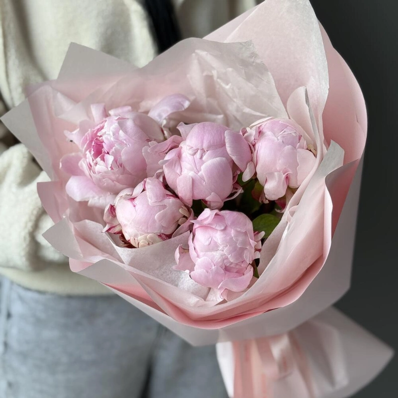 ГлавнаяКаталогБукетыБукет с 5 пионами Сара Бернар в нежной упаковке