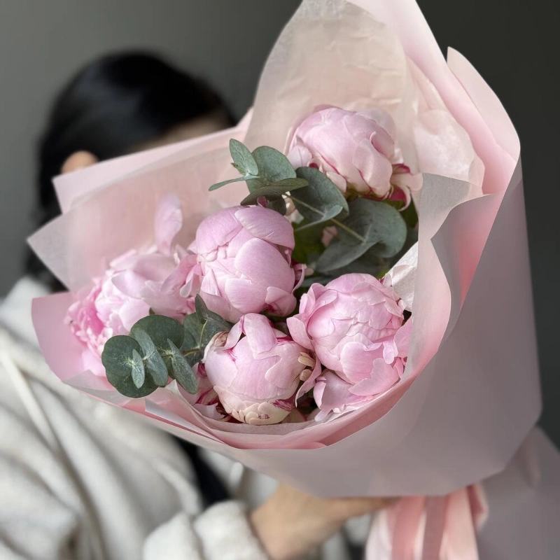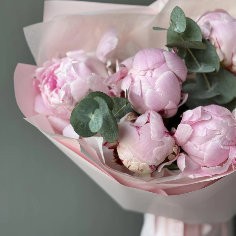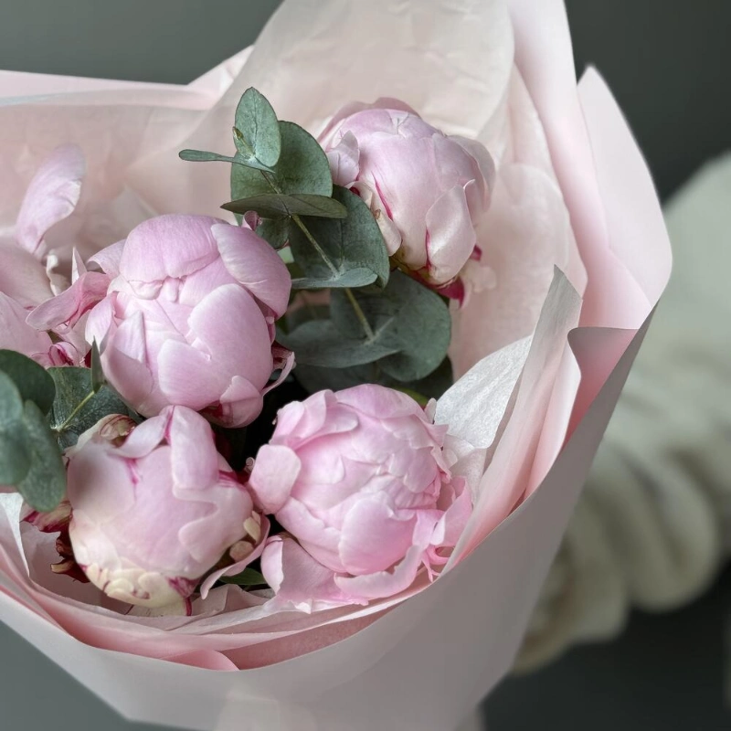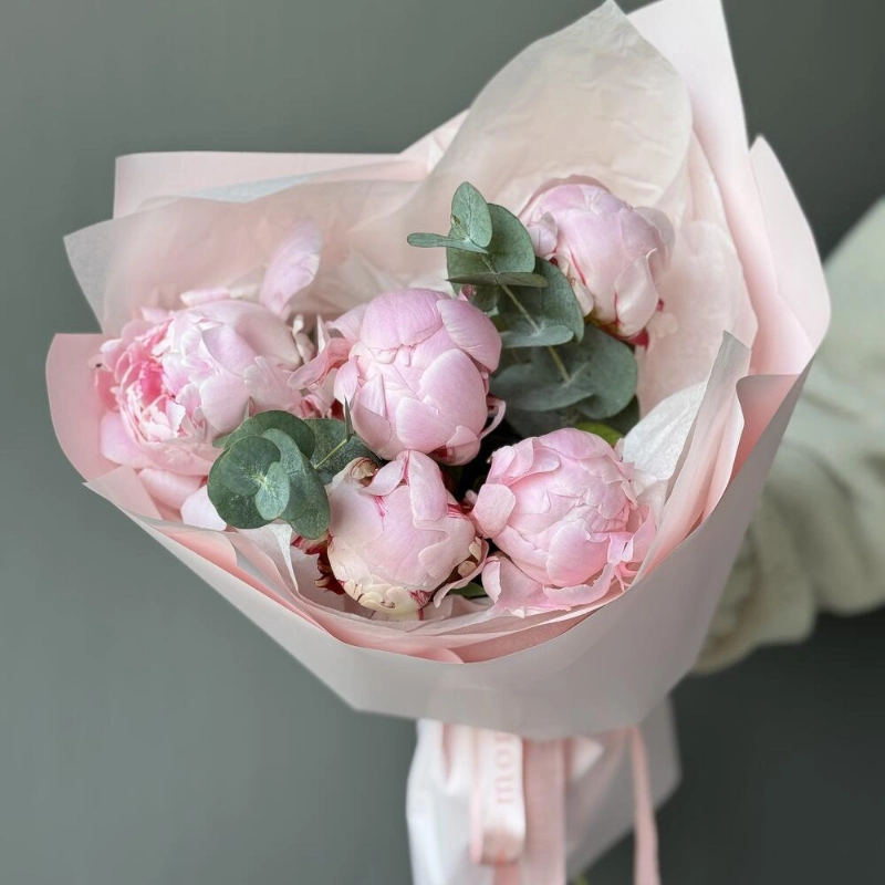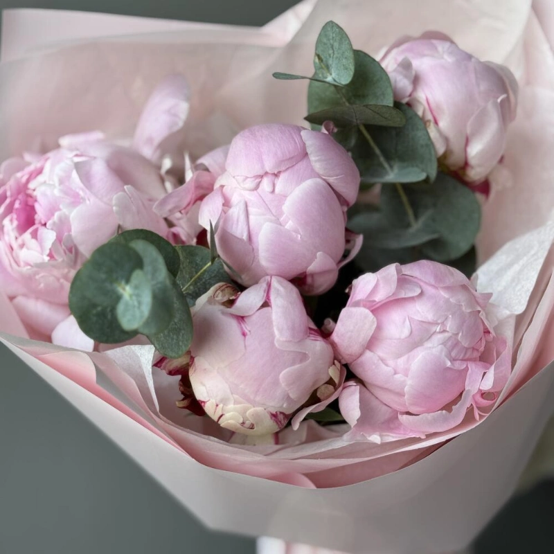 ГлавнаяКаталогБукетыБукет с 5 пионами и эвкалиптом