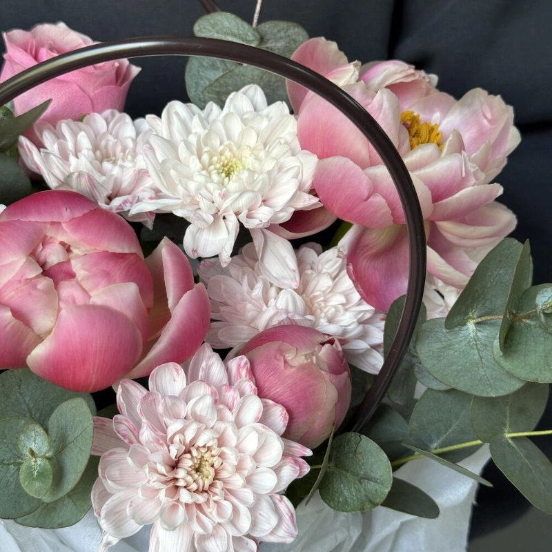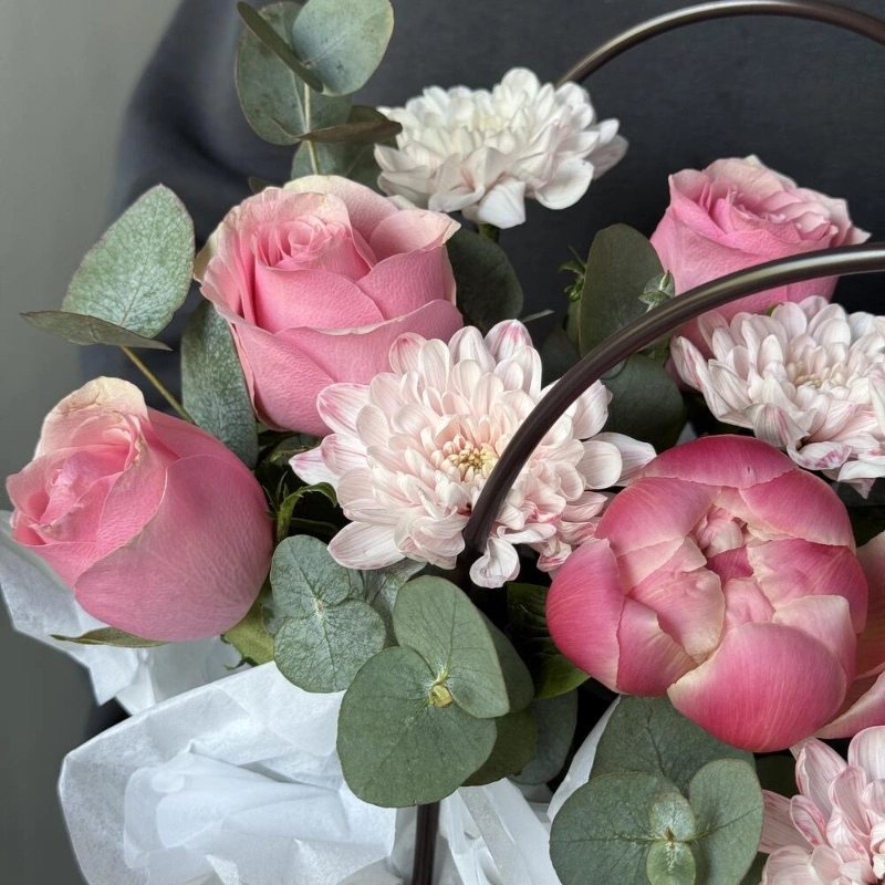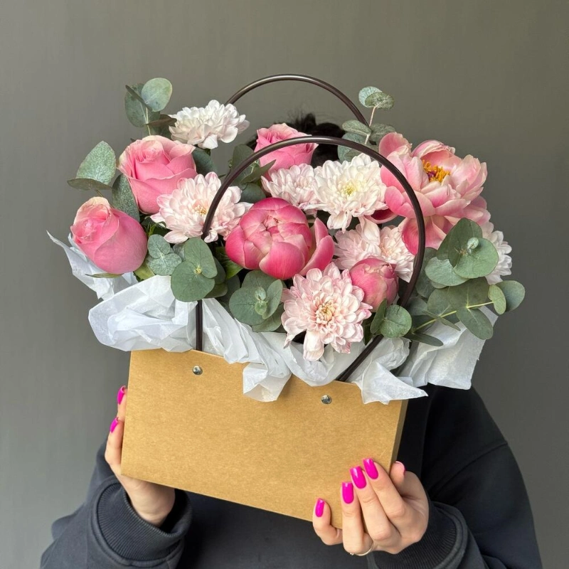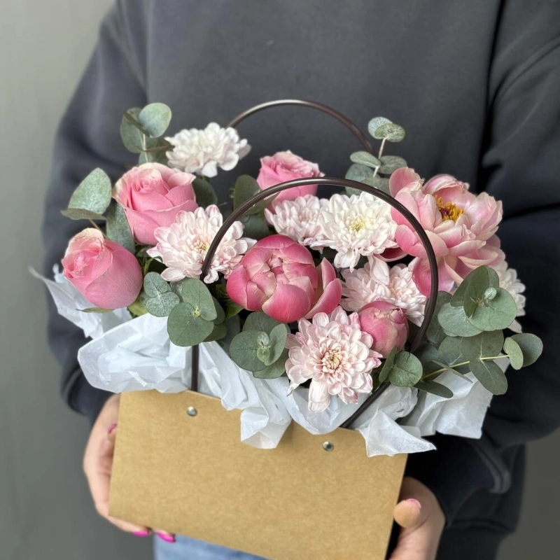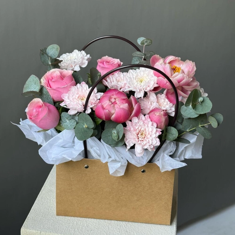 ГлавнаяКаталогБукетыСумочка «Пиономания» | пион Корал Шарм - эвкалипт - Роза Кения розовая