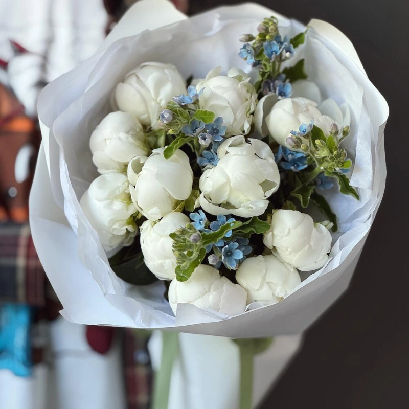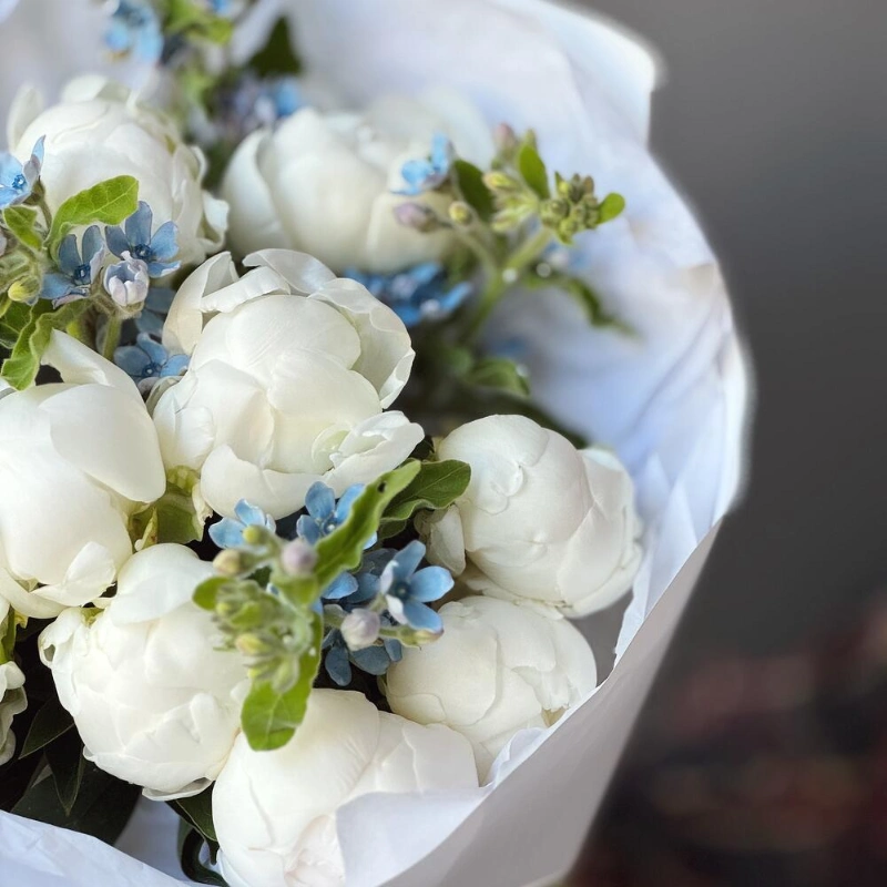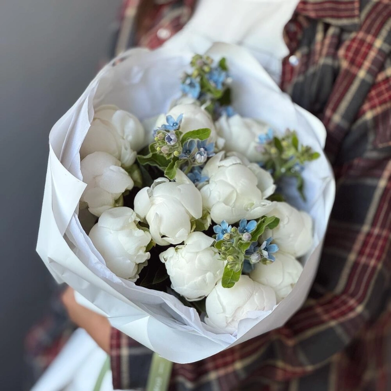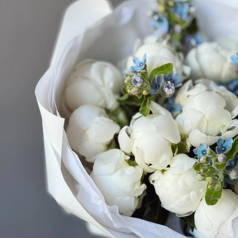 ГлавнаяКаталогБукетыБукет «Пиокси 3.0» | пион белый 11 - незабудка