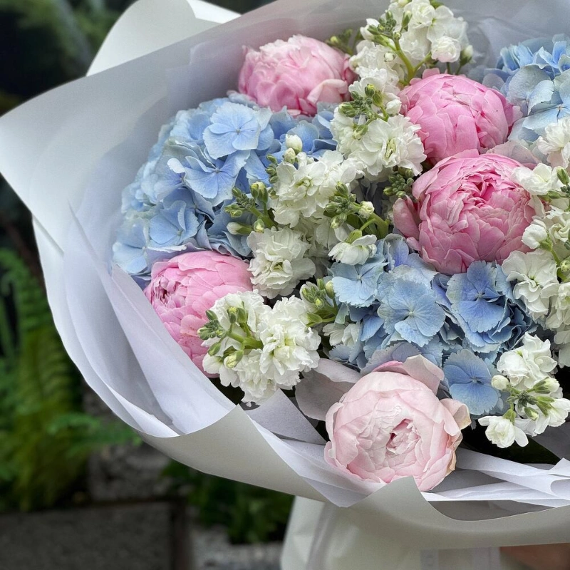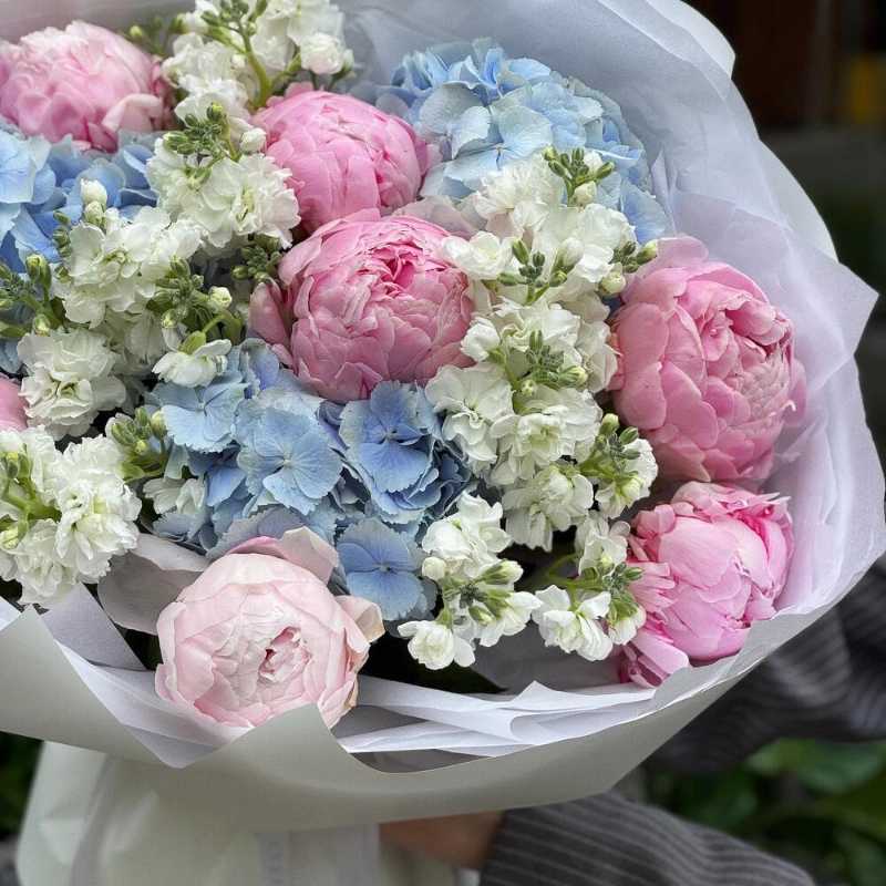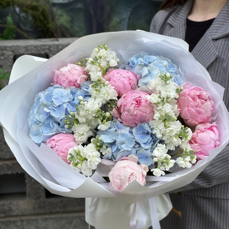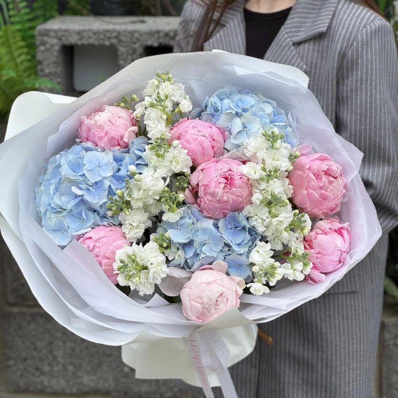ГлавнаяКаталогБукетыПионы, гортензия и маттиола «Моя Вселенная»