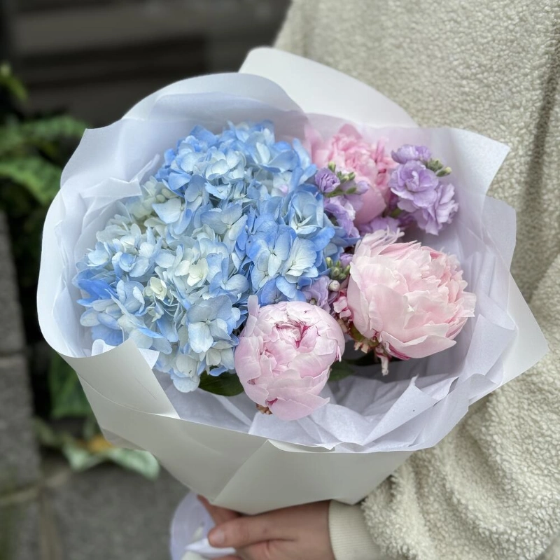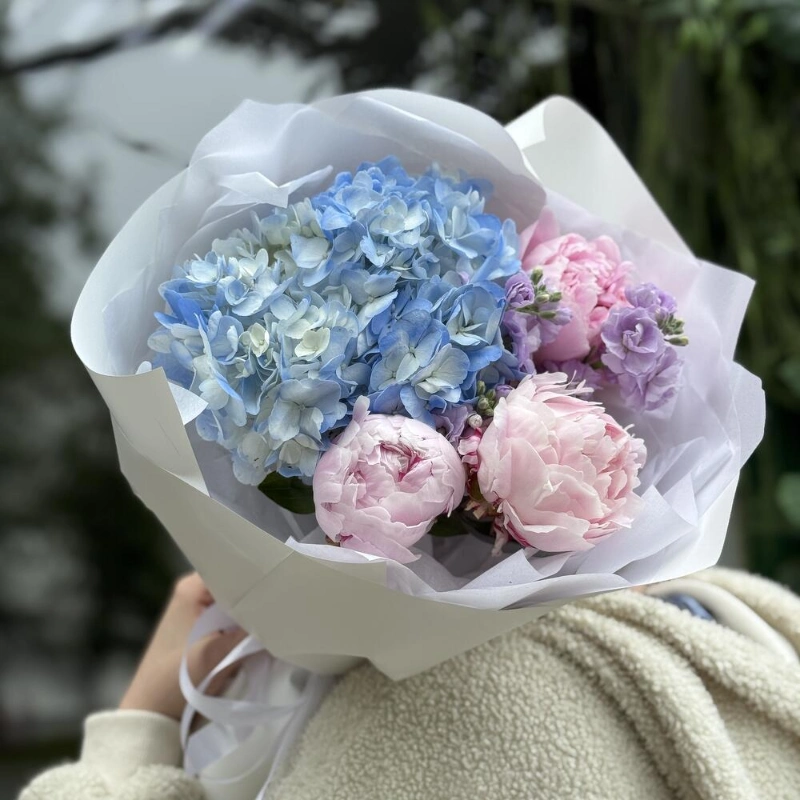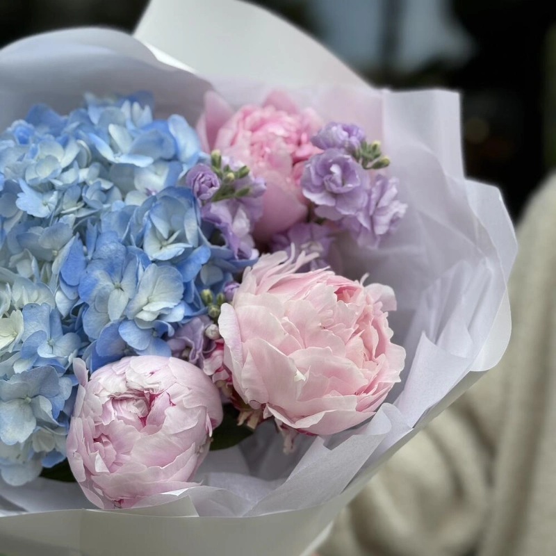 Букет «А это облачко на что похоже?» | пион Сара Бернар - гортензия - маттиола