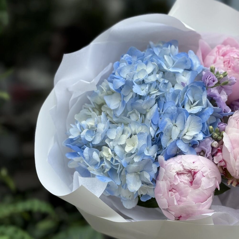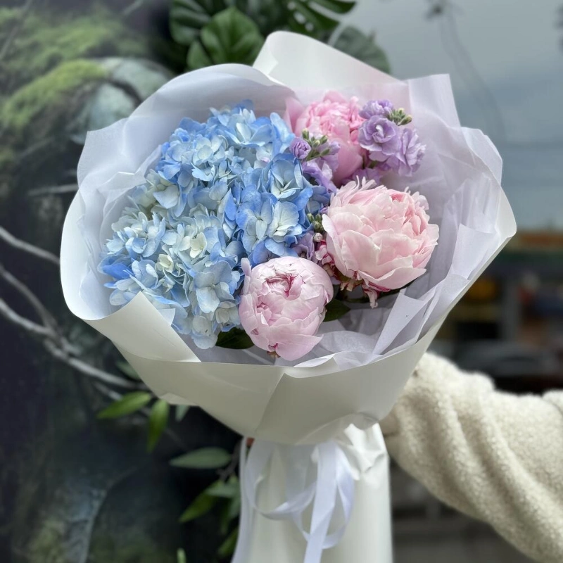 ГлавнаяКаталогБукетыБукет «А это облачко на что похоже?» | пион Сара Бернар - гортензия - маттиола