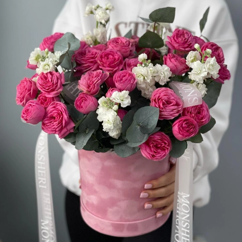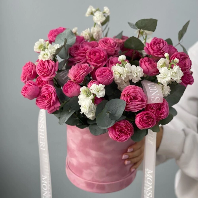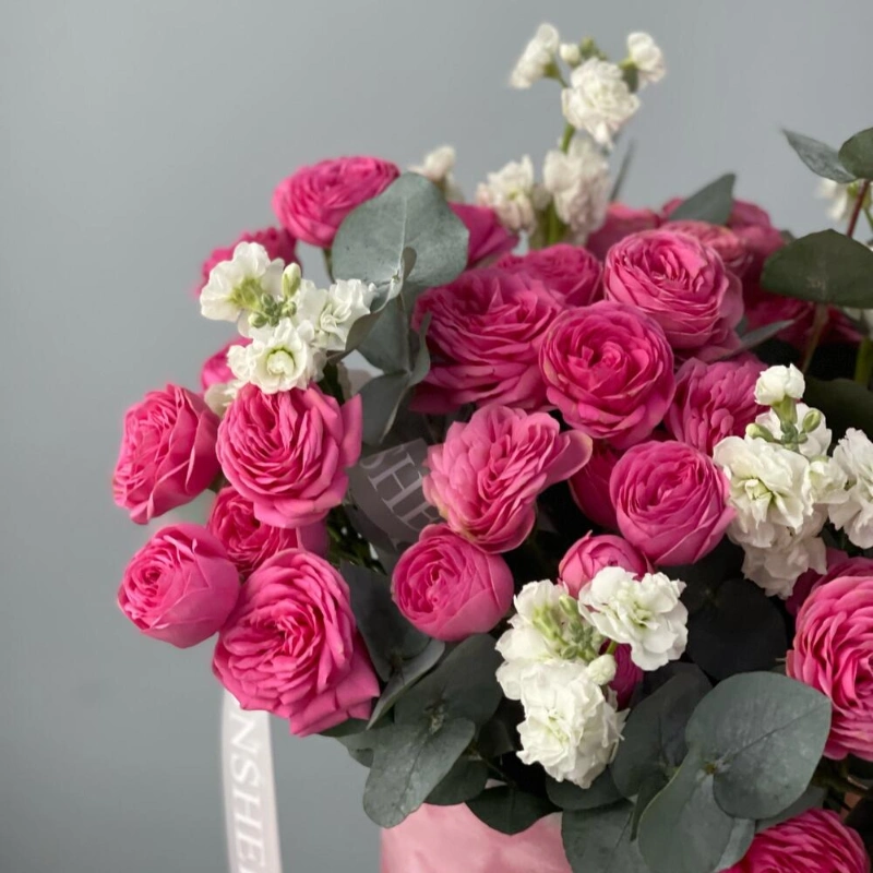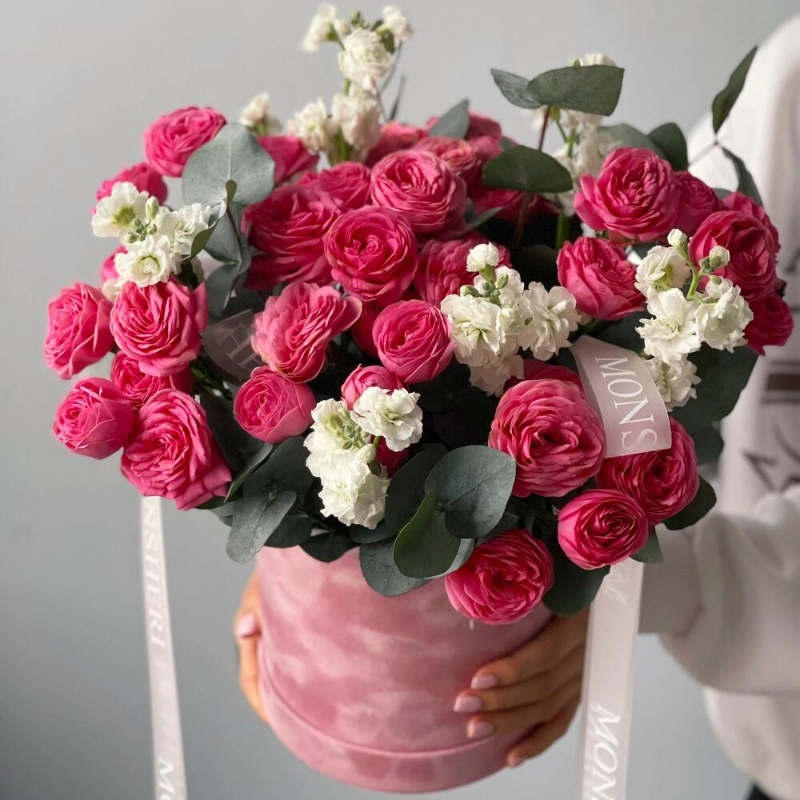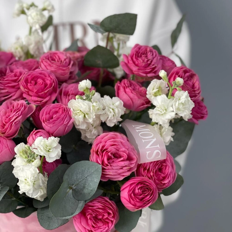 Цветы в коробке из кустовых пионовидных роз и маттиолы