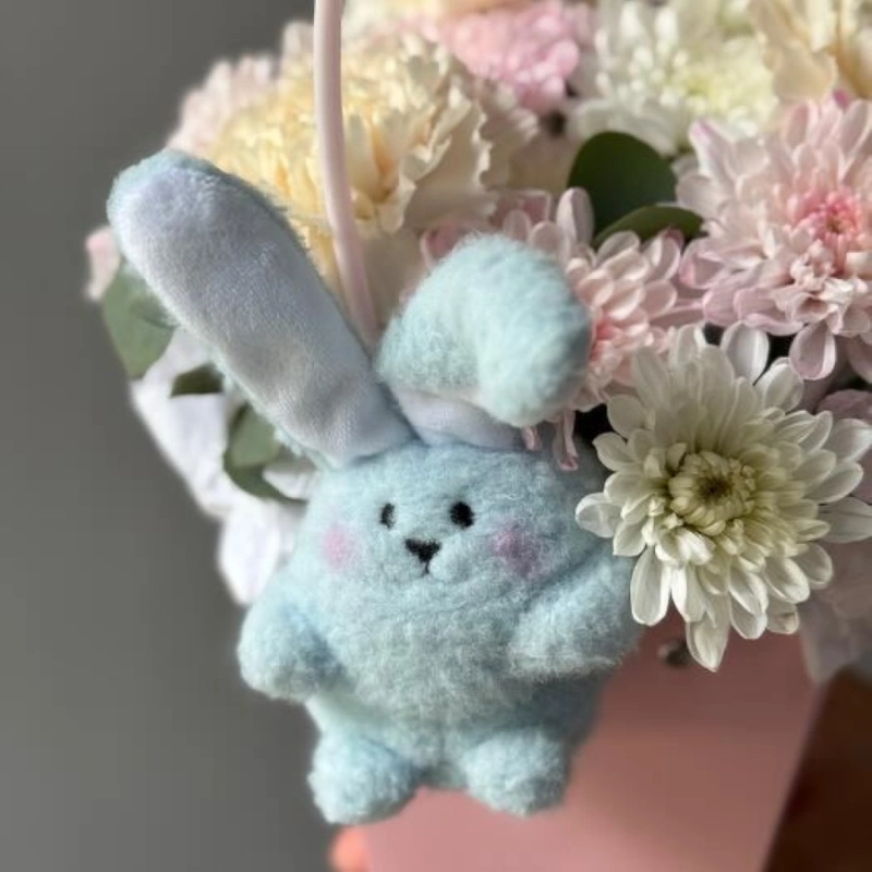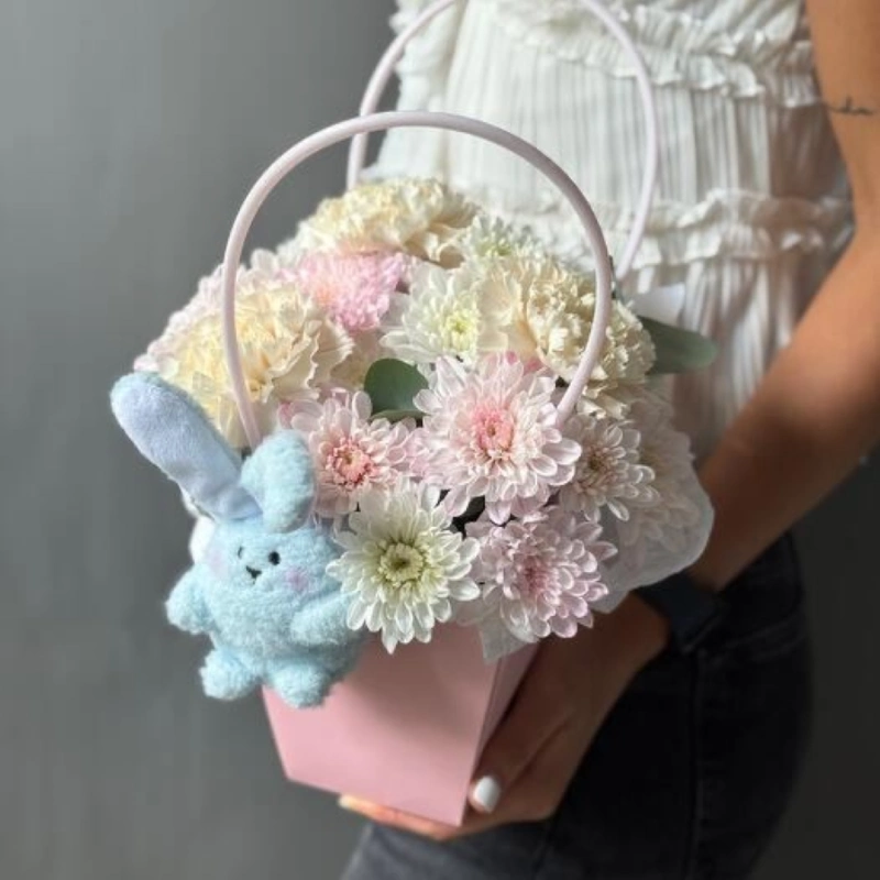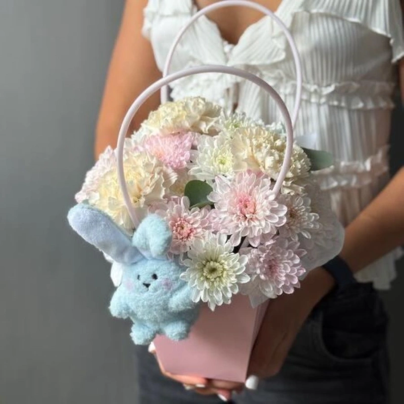 Нежная композиция в сумочке с милой мягкой игрушкой зайкой! Очень стойкий состав, поэтому композиция будет долго радовать получателя своей нежностью 🌸