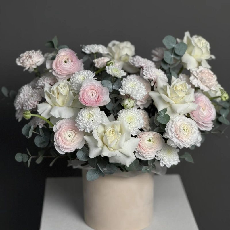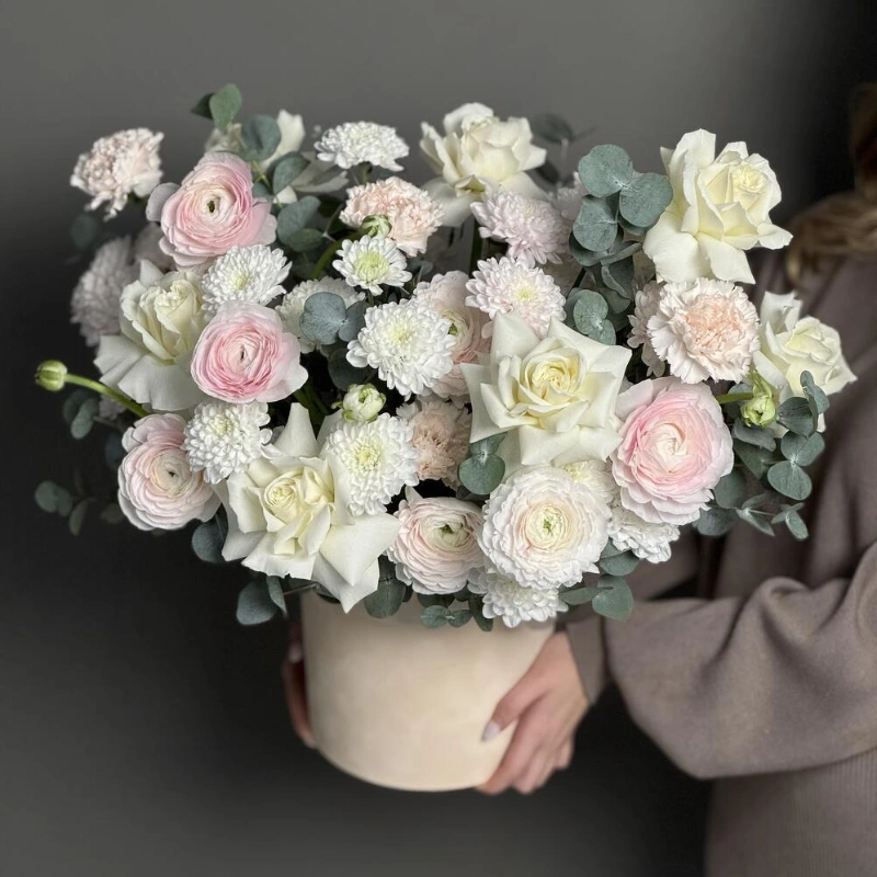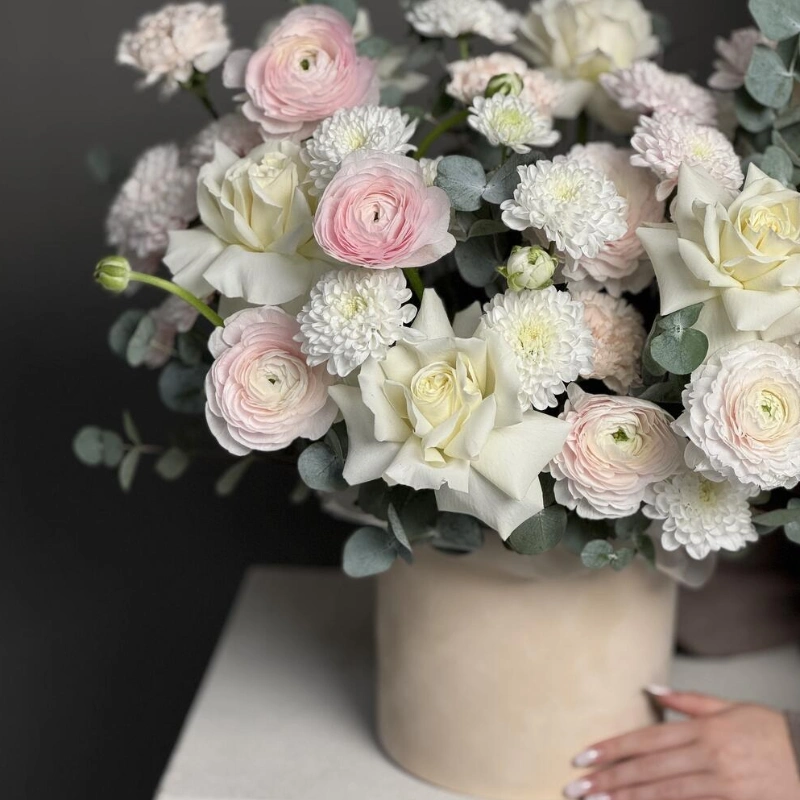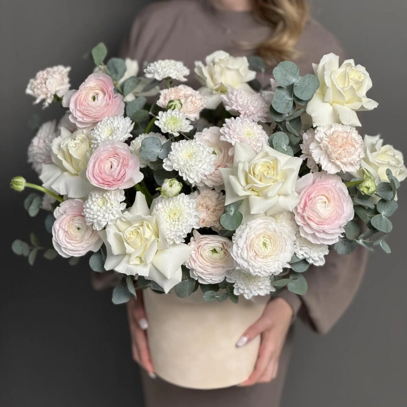 Нежная композиция со всеми любимыми ранункулюсами, стойкими диантусами, кустовыми хризантемами и белоснежными розами