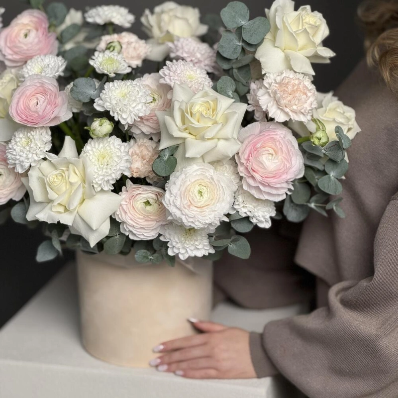 ГлавнаяКаталогКомпозицииНежная композиция с ранункулюсами в коробке