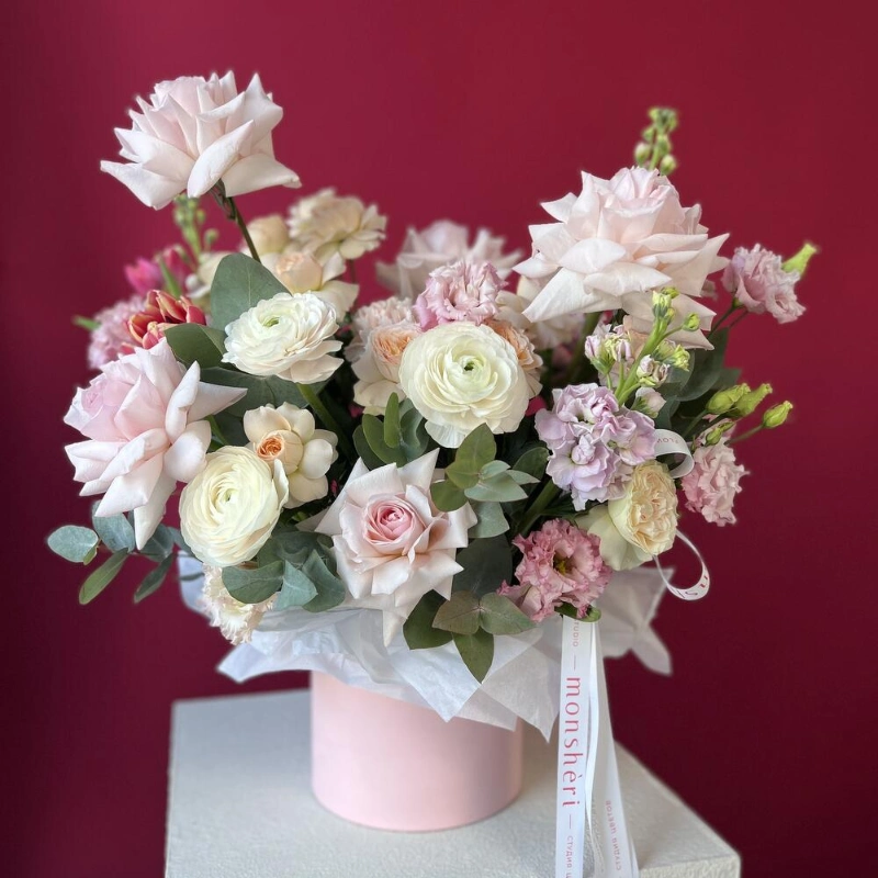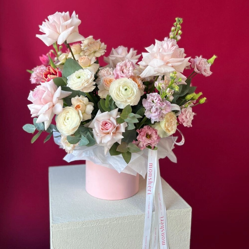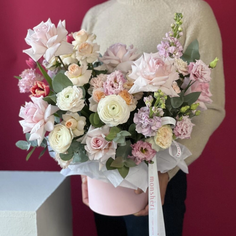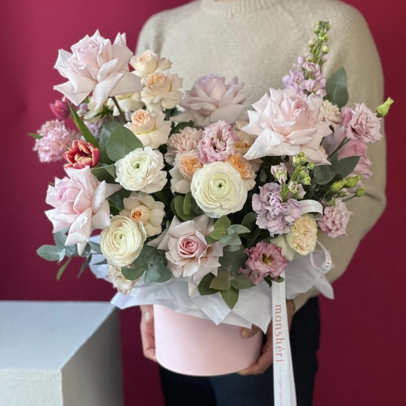 Роскошная композиция в шляпной коробке с разнообразным составом из самых красивых необычных цветов! Легкий нежный аромат, разнообразие форм и фактур представленных в данной композиции не оставит равнодушным. Подпишем открытку и бережно доставим прямо в руки получателя!