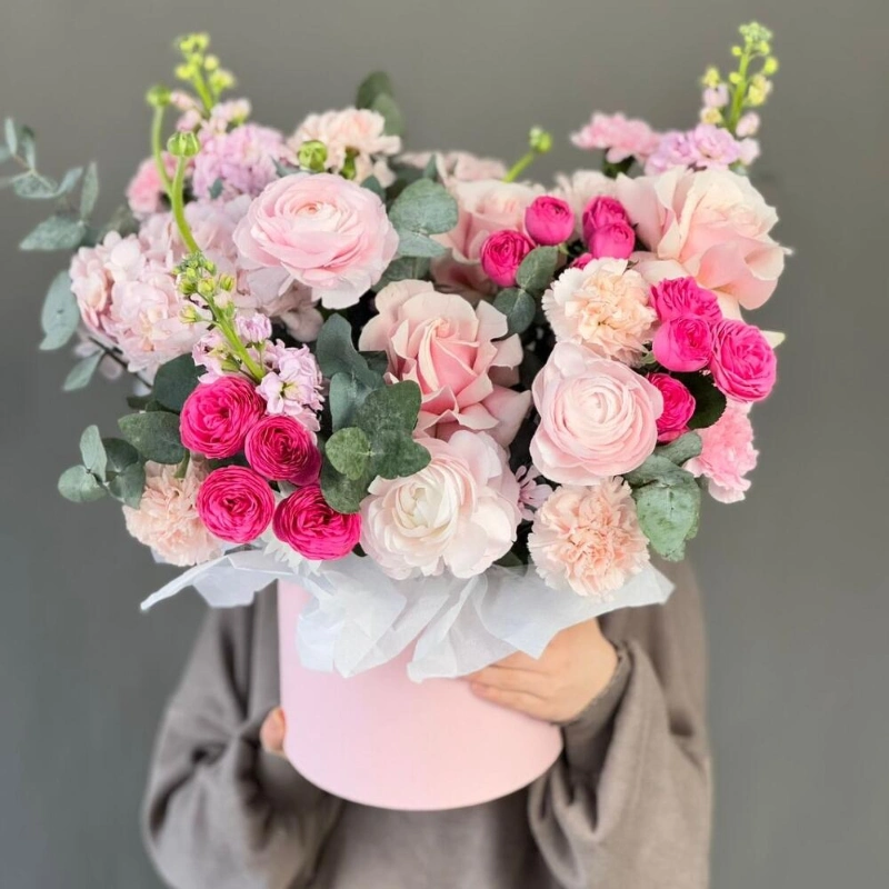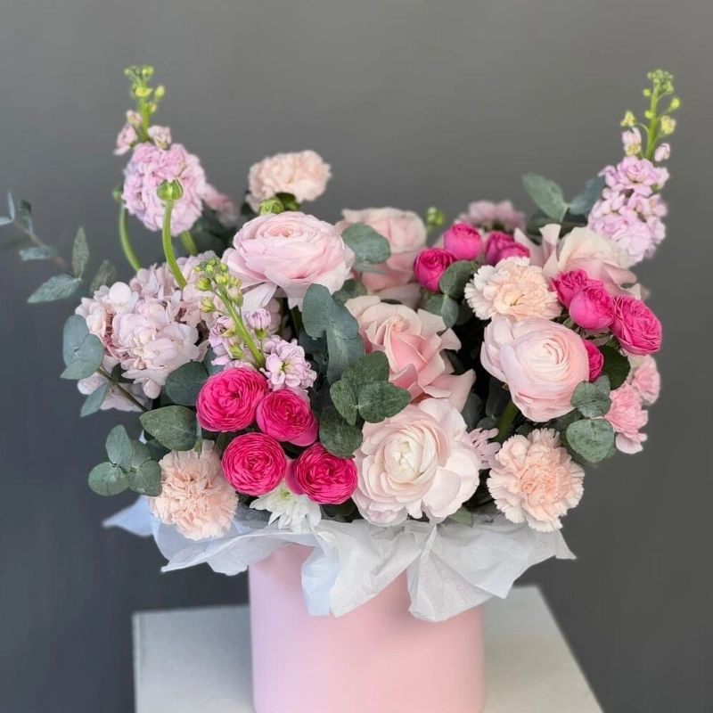 Нежная композиция с ранункулюсами в коробке