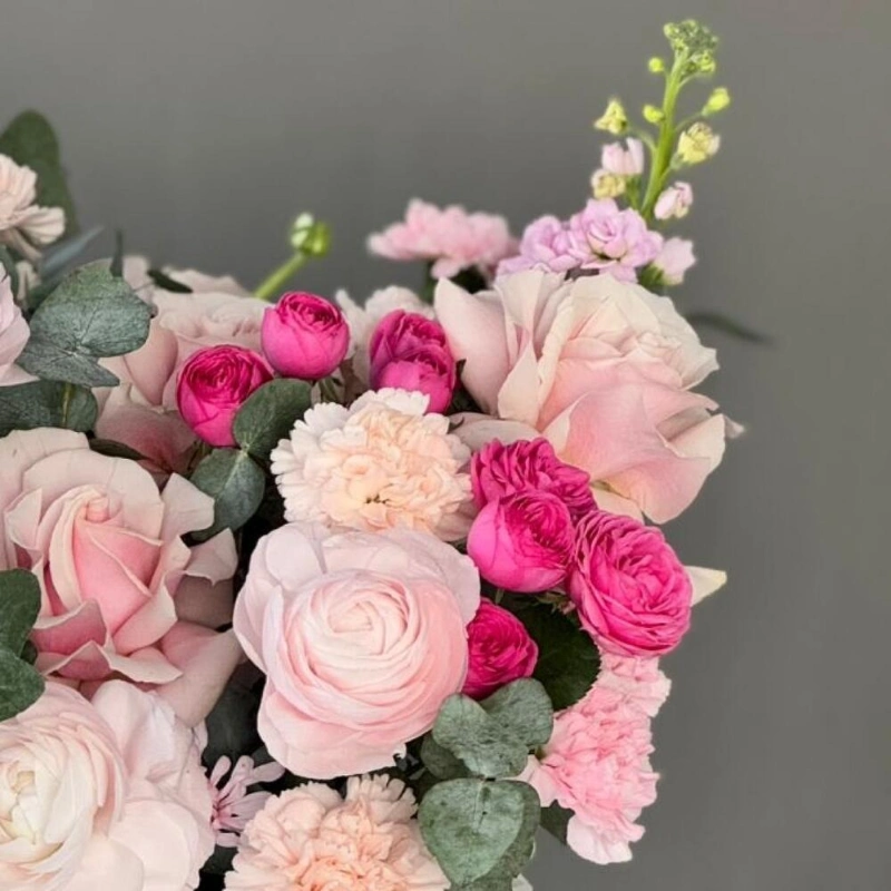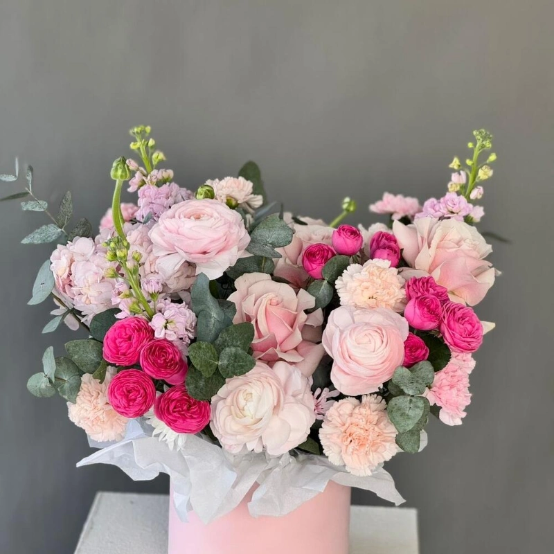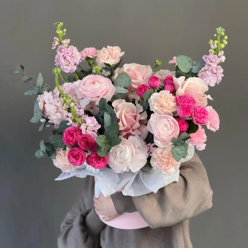 Цветы в коробке из кустовых пионовидных роз и маттиолы
