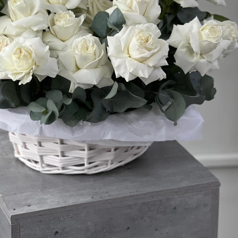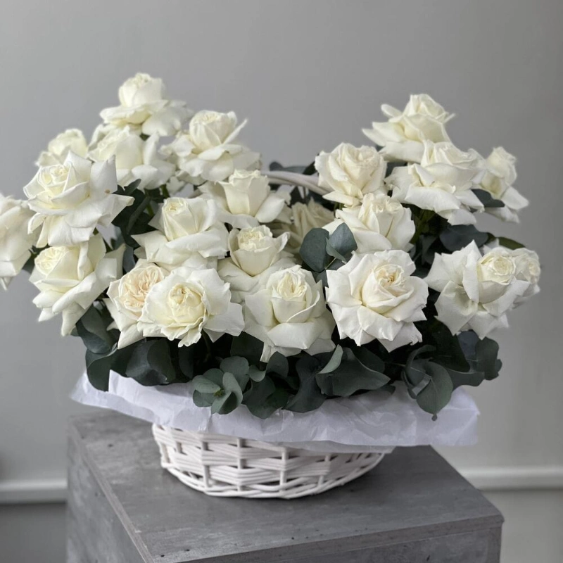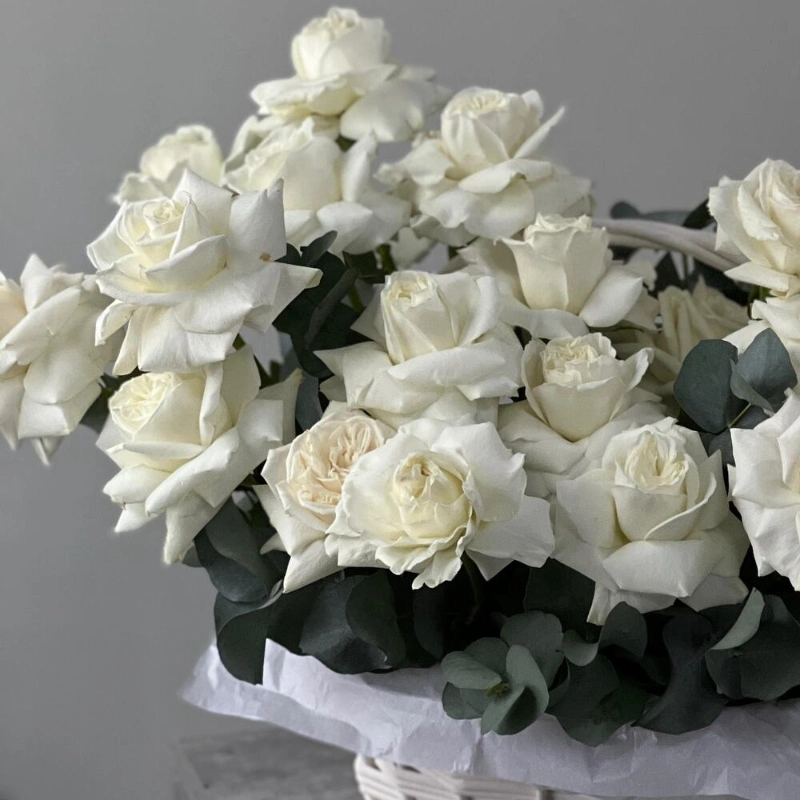 ГлавнаяКаталогКомпозицииКорзина с белыми розами и эвкалиптом