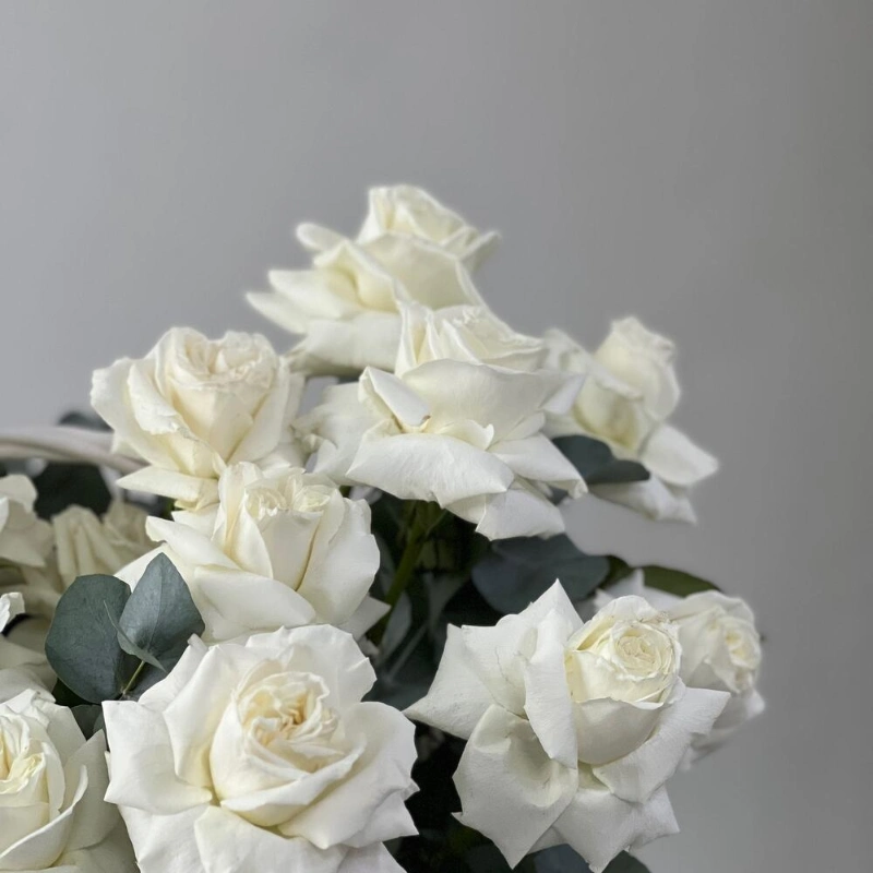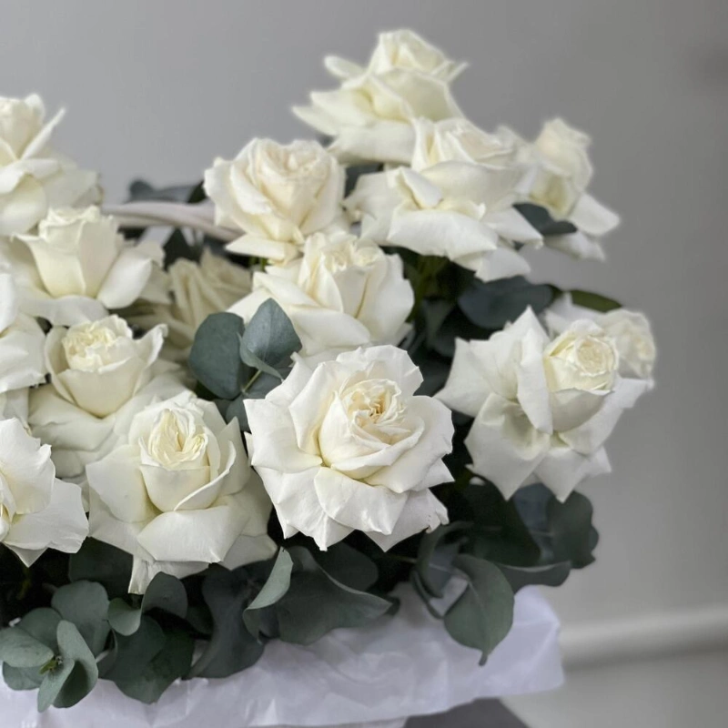 Стильная роскошная композиция из белоснежных роз и эвкалипта- для выражения самых искренних сильных чувств. Лепестки Розы playa Blanca вывернуты флористом по специальной технологии, что придает им пышности и эксклюзива