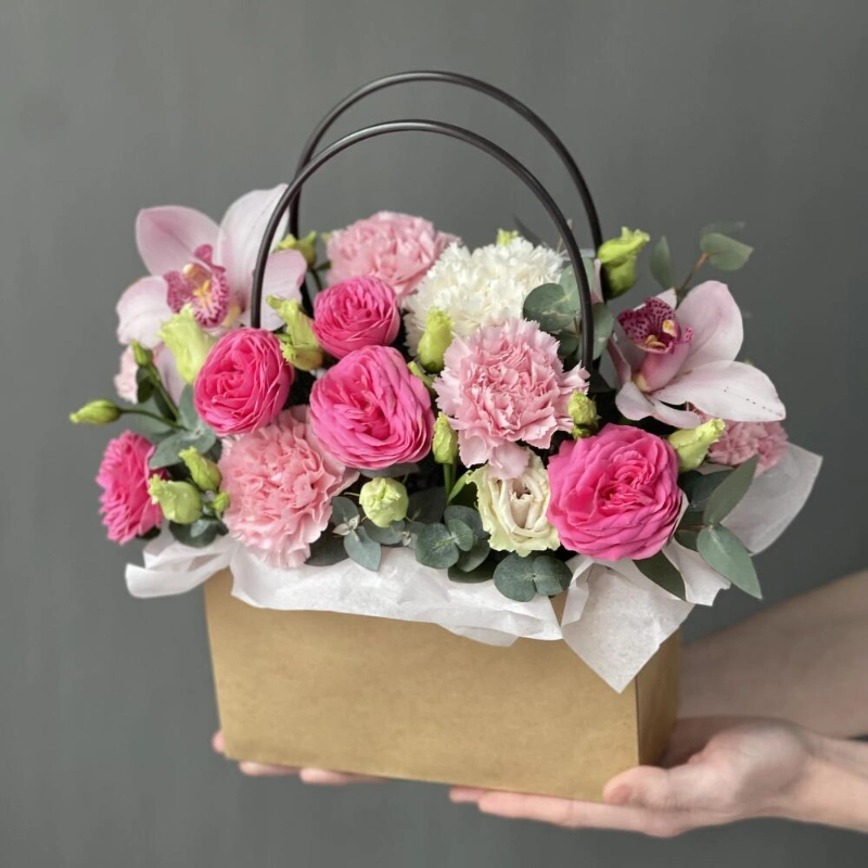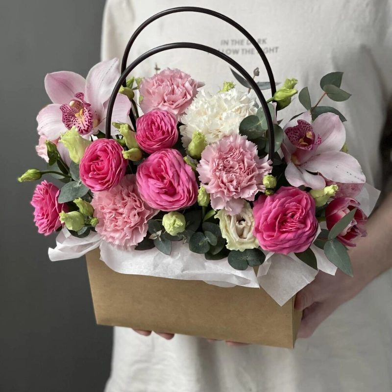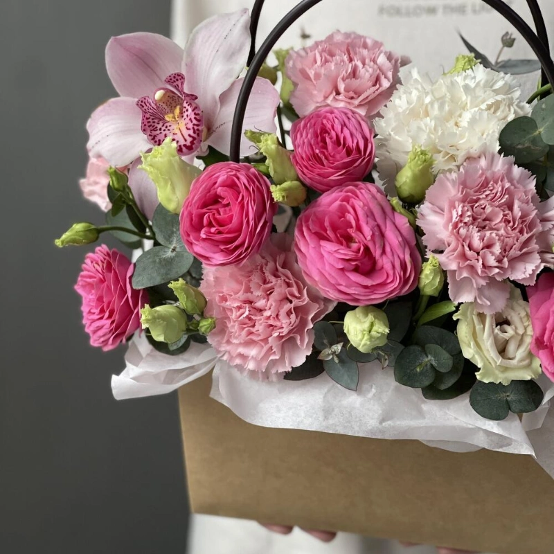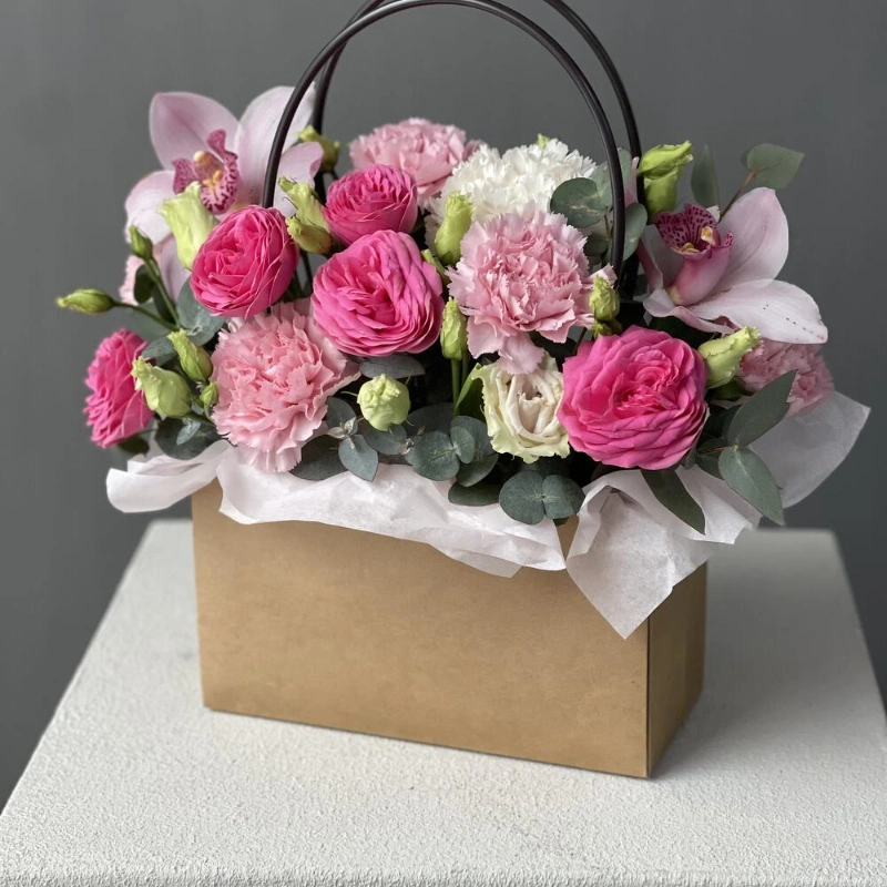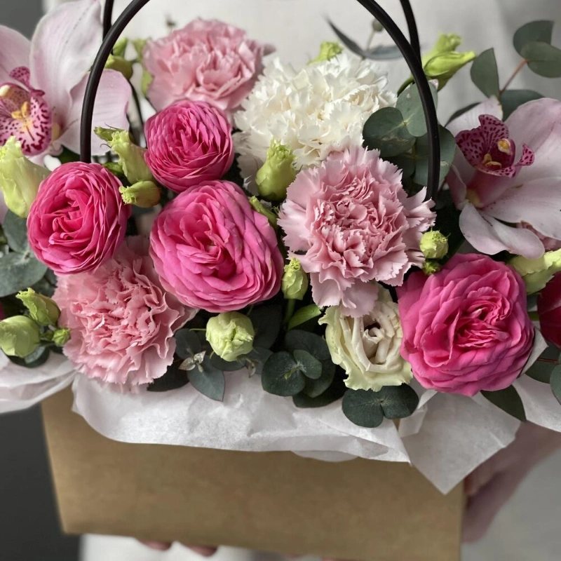 ГлавнаяКаталогКомпозицииКомпозиция с орхидеей, кустовыми пионовидными розами и диантусом
