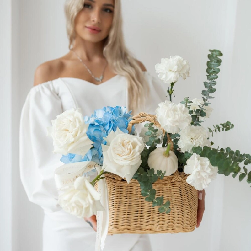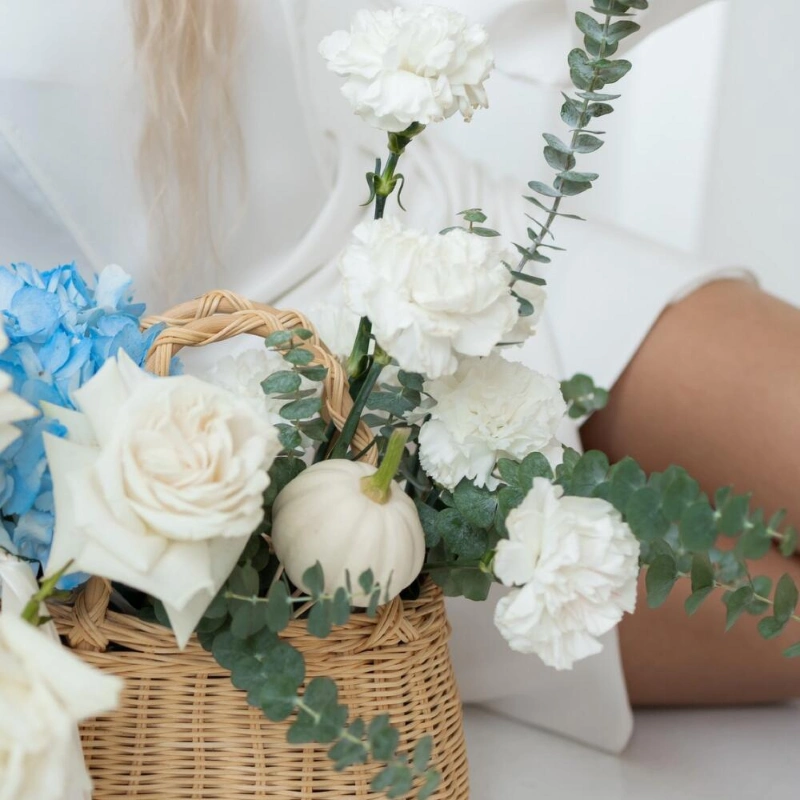 Плетеная корзина с ароматными цветами и декоративной тыквой