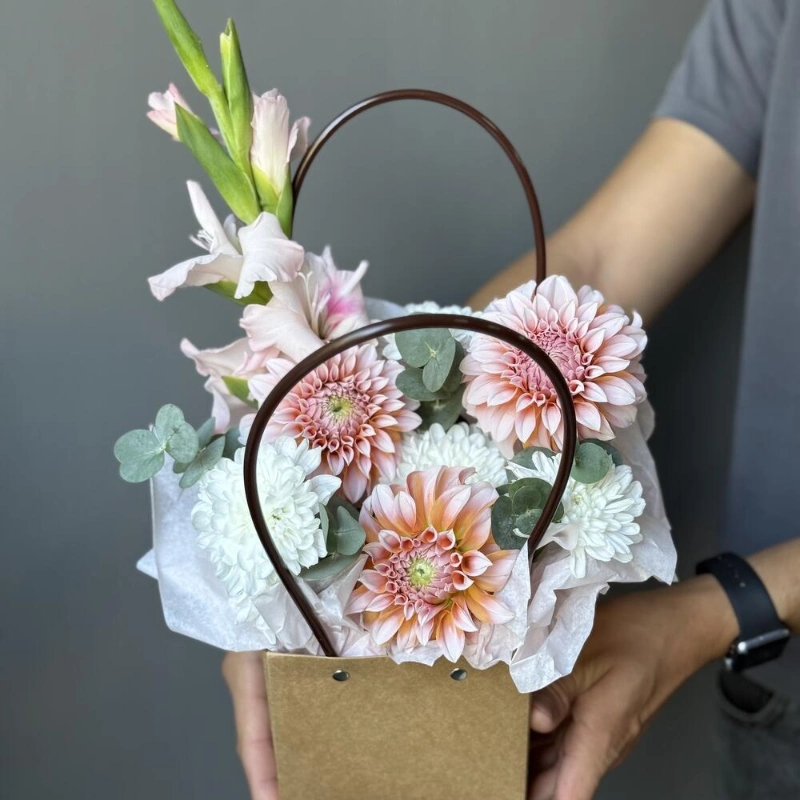 ГлавнаяКаталогКомпозицииЦветы в сумочке с георгинами