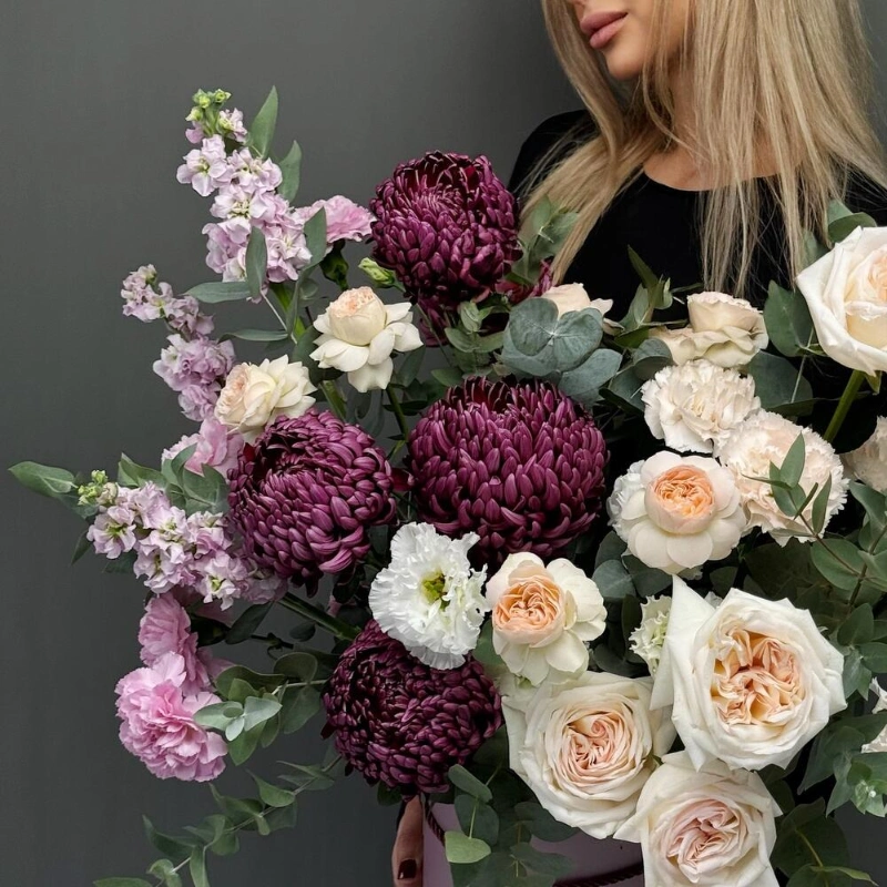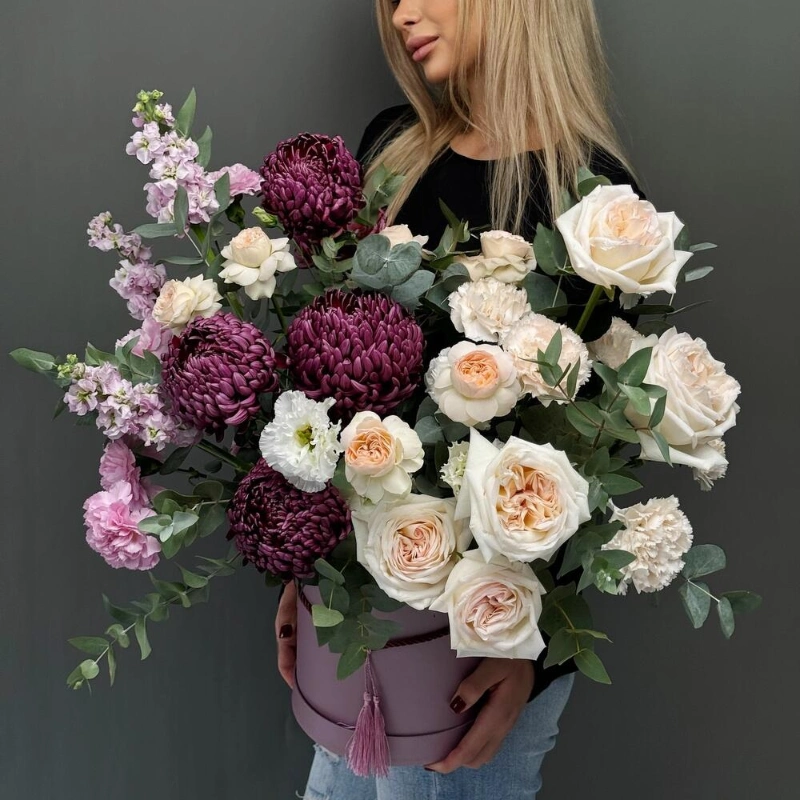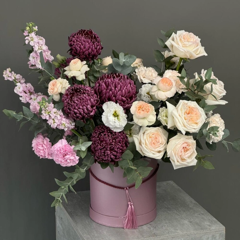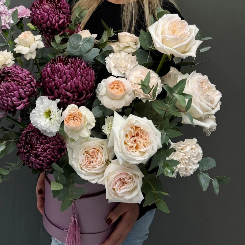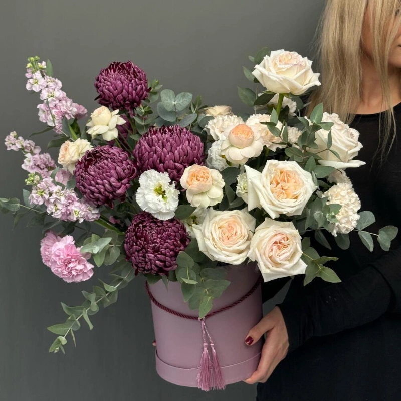 ГлавнаяКаталогКомпозиция в коробке с розами и хризантемой Бигуди