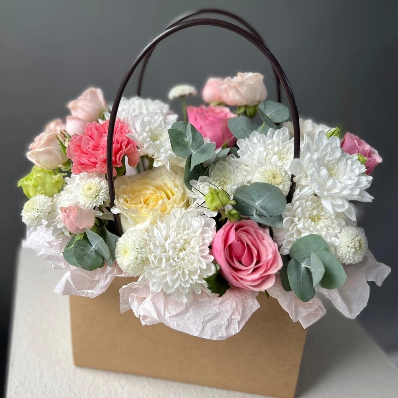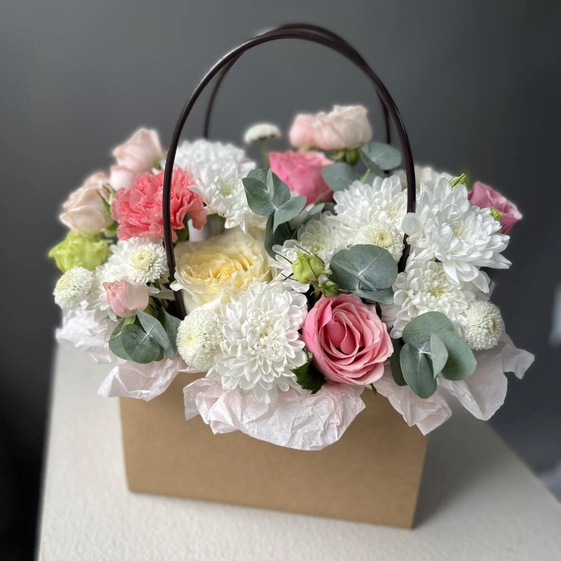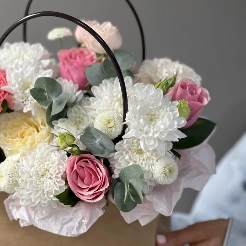 Композиция в сумочке с ажурной эустомой