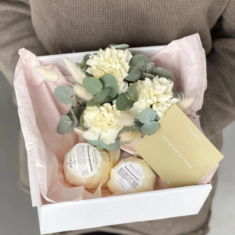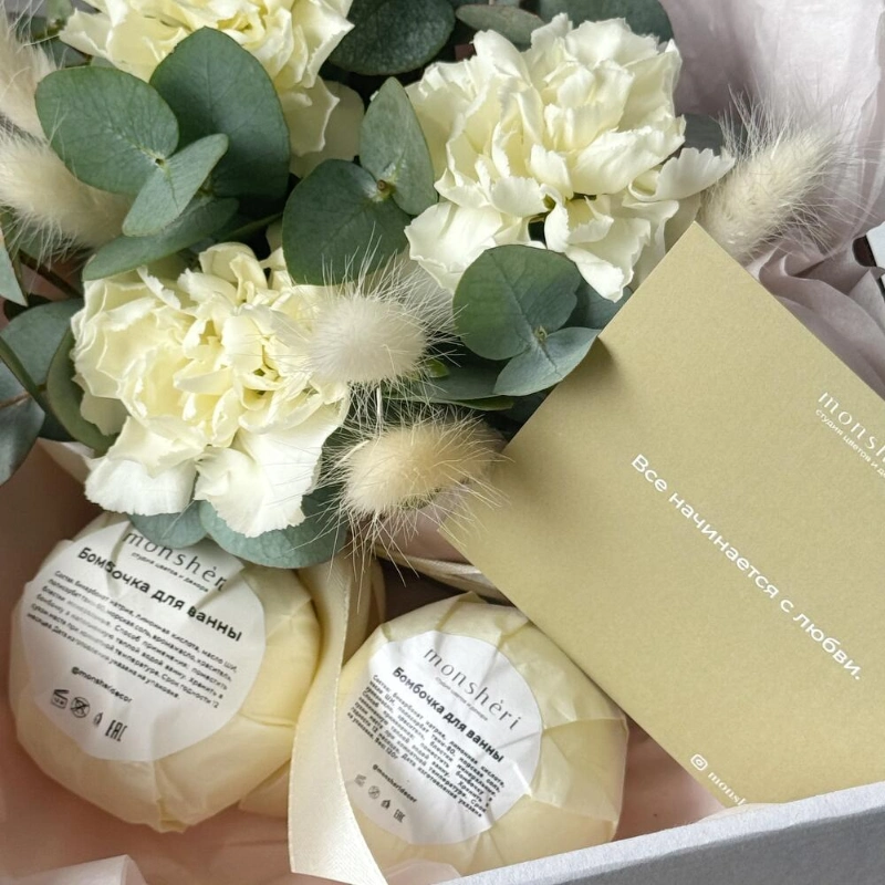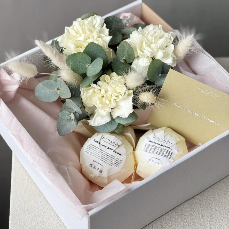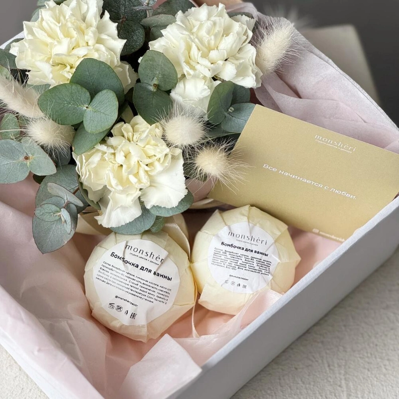 Подарочный набор с бомбочками для ванн и цветочной композицией