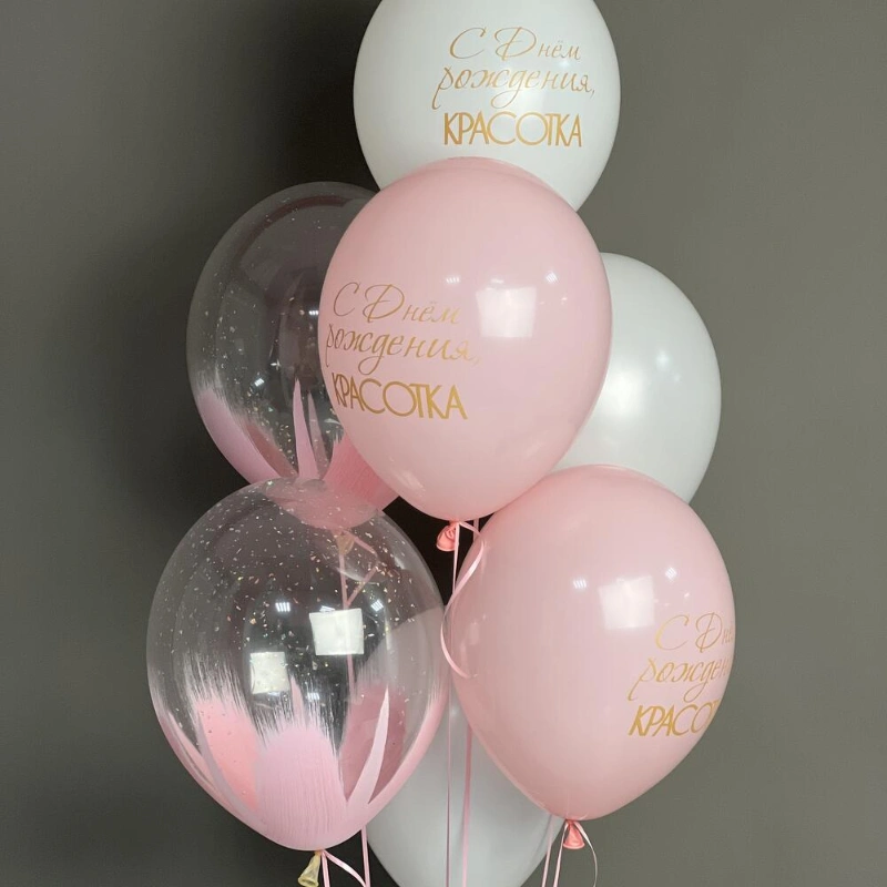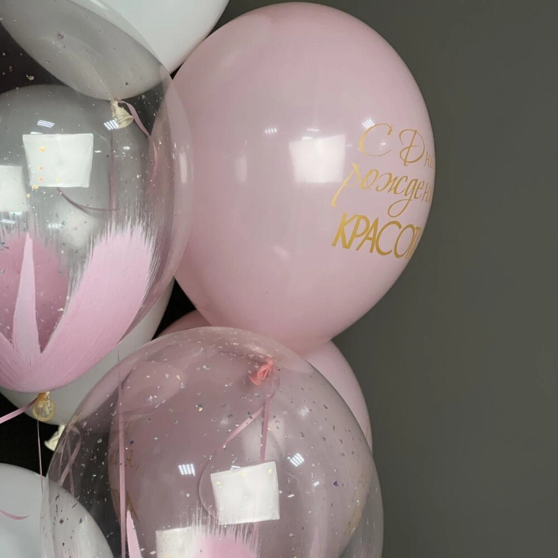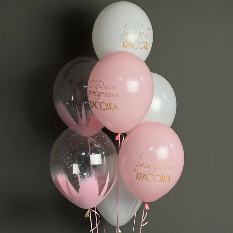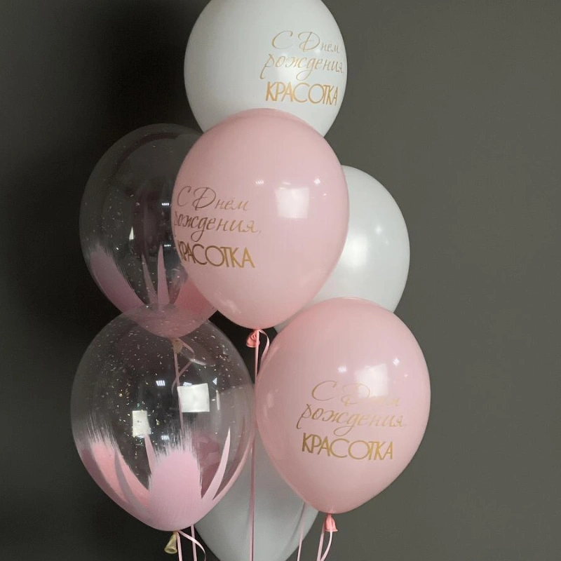 В составе 2 шара с блестками , 3 латексных шара с надписью, 2 латексных шара