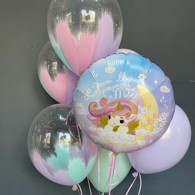 Сет состоит из фонтана гелиевых шаров и фольгированного шарика «Этот мир прекрасен как и ты»🦄🩷🦋