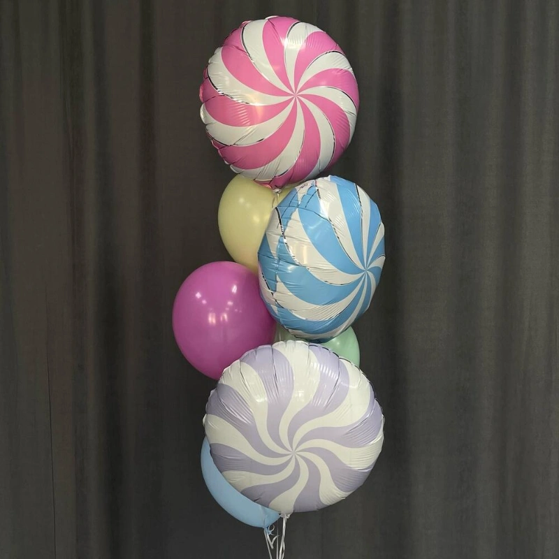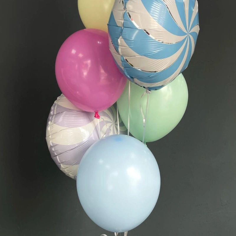 Латексные шары нежного оттенка в комплекте с фольгированными шарами в виде карамели отлично подойдут для украшения ваших мероприятий !