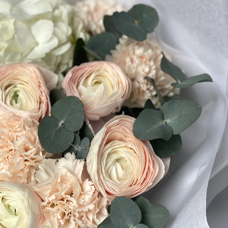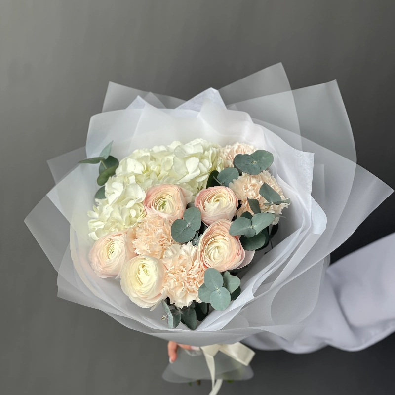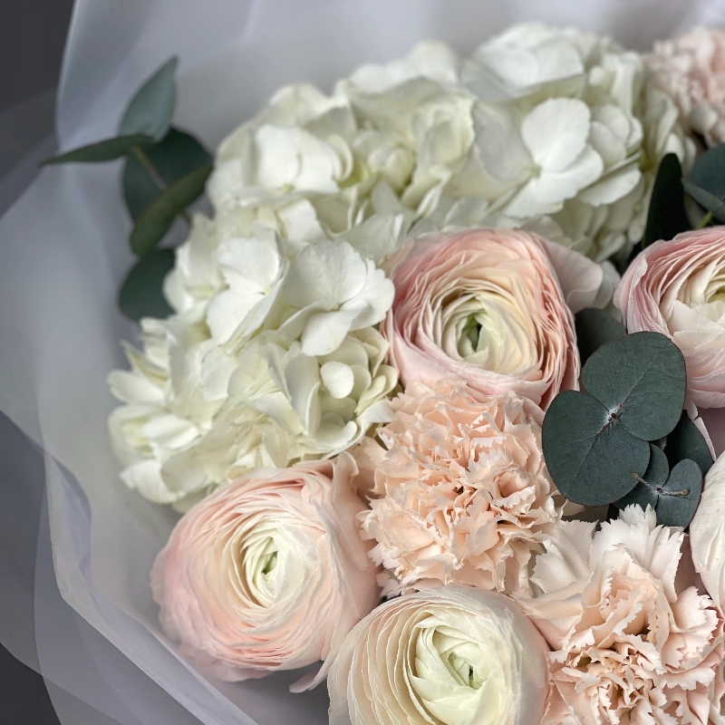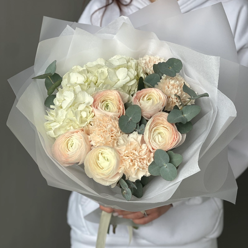ГлавнаяКаталогНежный букет с ранункулюсами, гортензией и диантусами