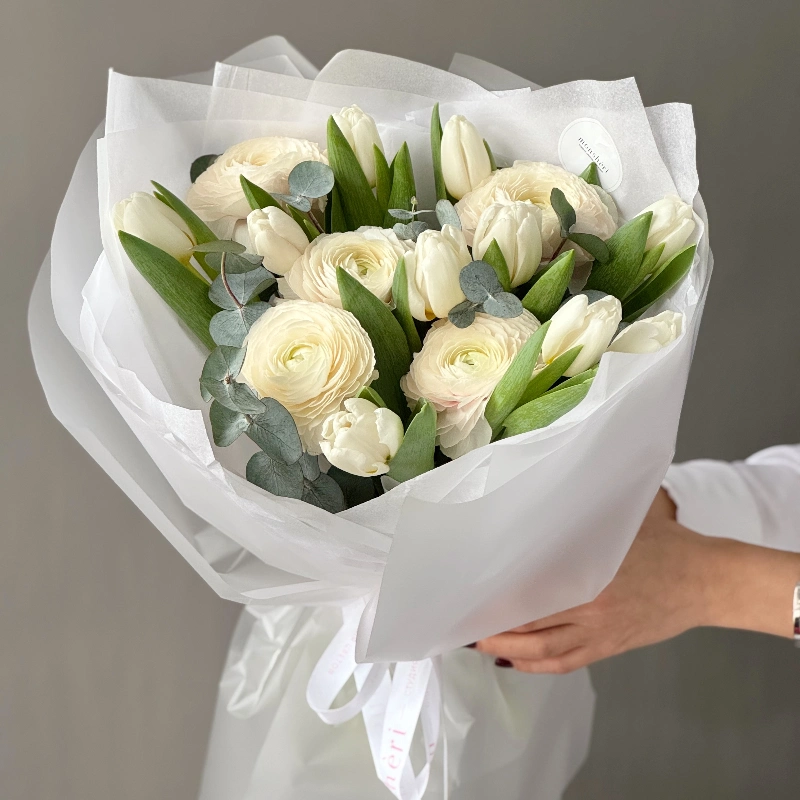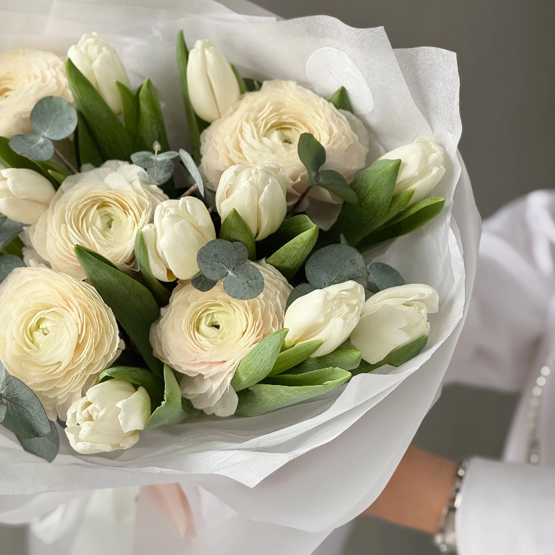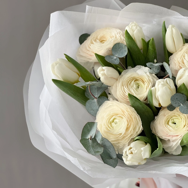 Нежный авторский букет с ранункулюсами и тюльпанами
