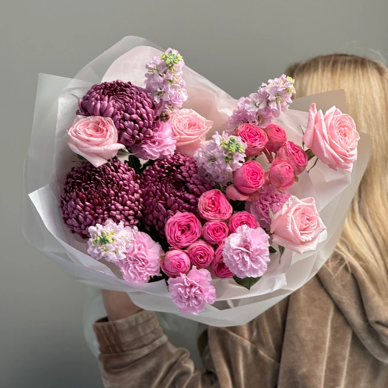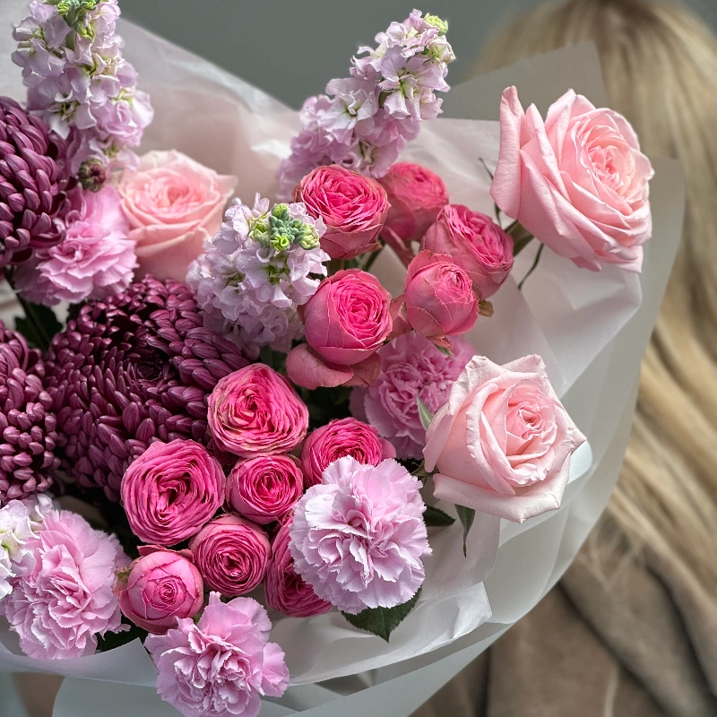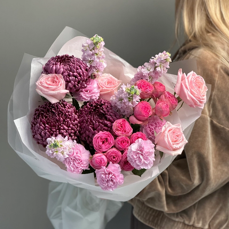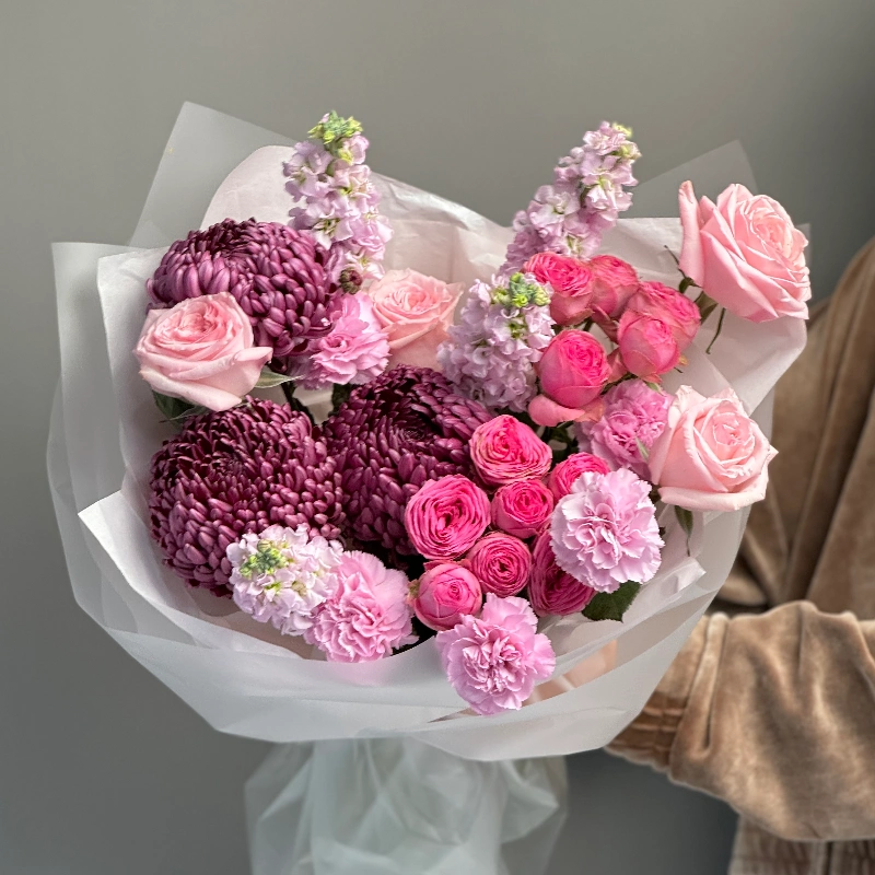 Авторский букет с маттиолой и кустовыми пионовидными розами