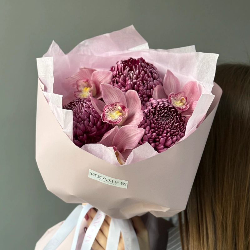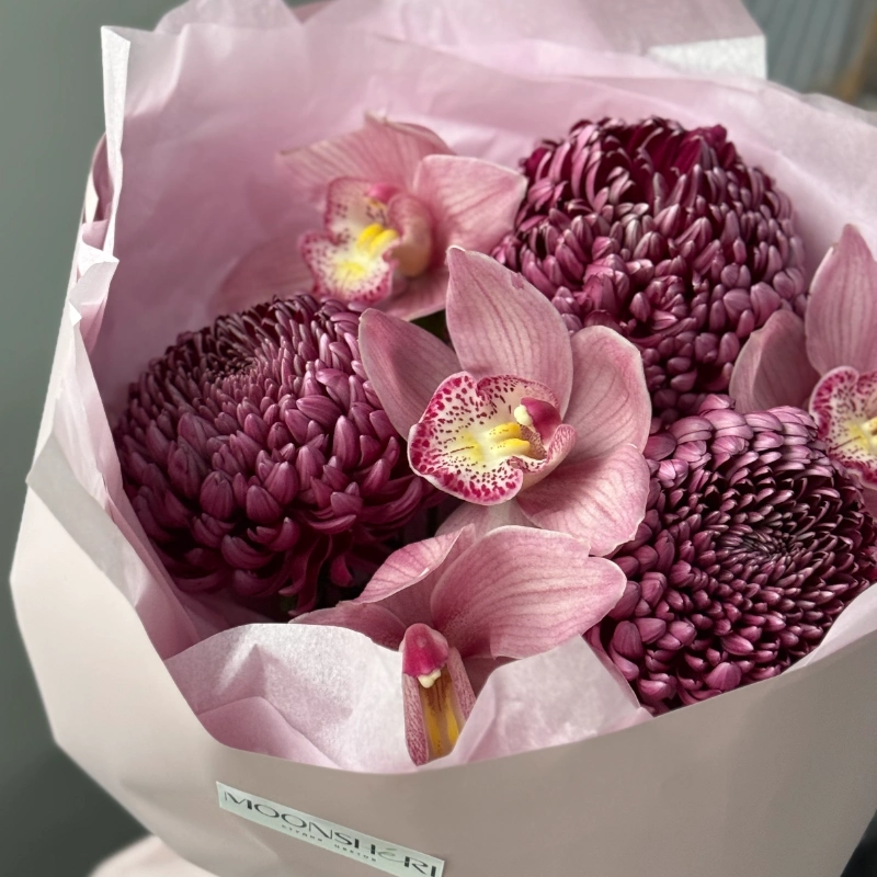 ГлавнаяКаталогНежный осенний букет с Хризантемой бигуди и орхидеей