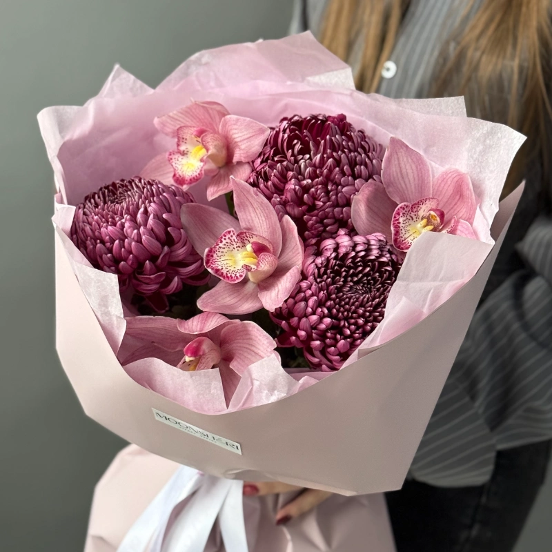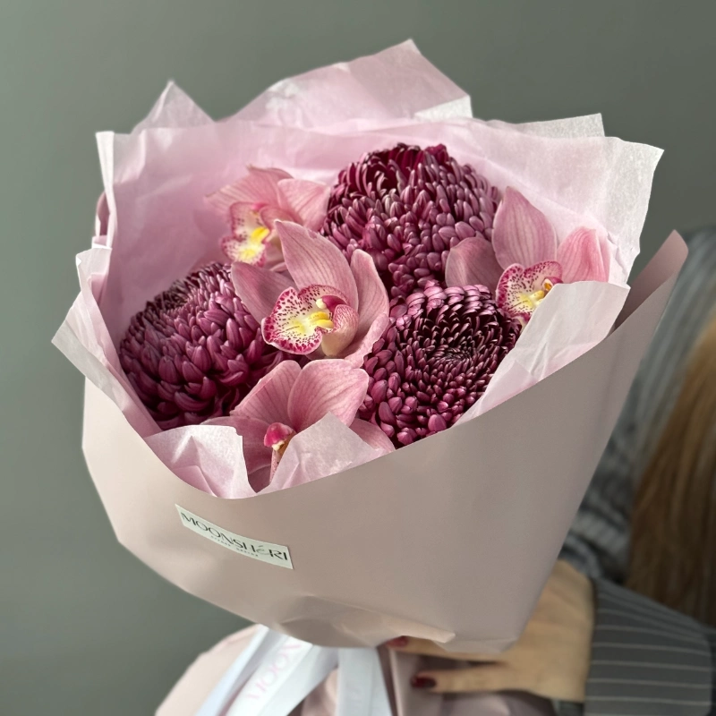 Нежный осенний букет с Хризантемой бигуди и орхидеей
