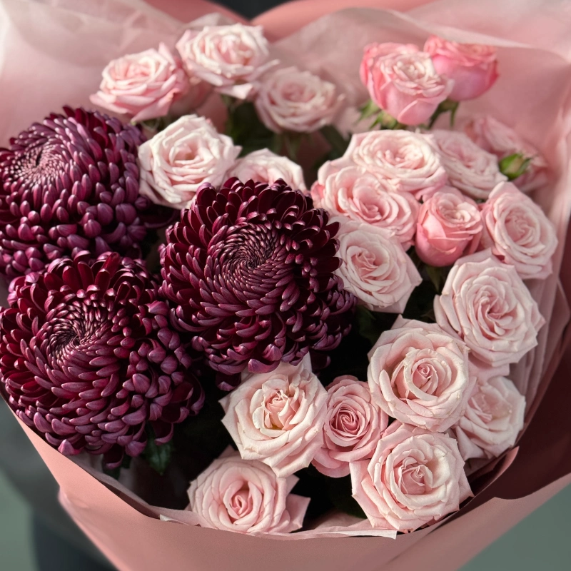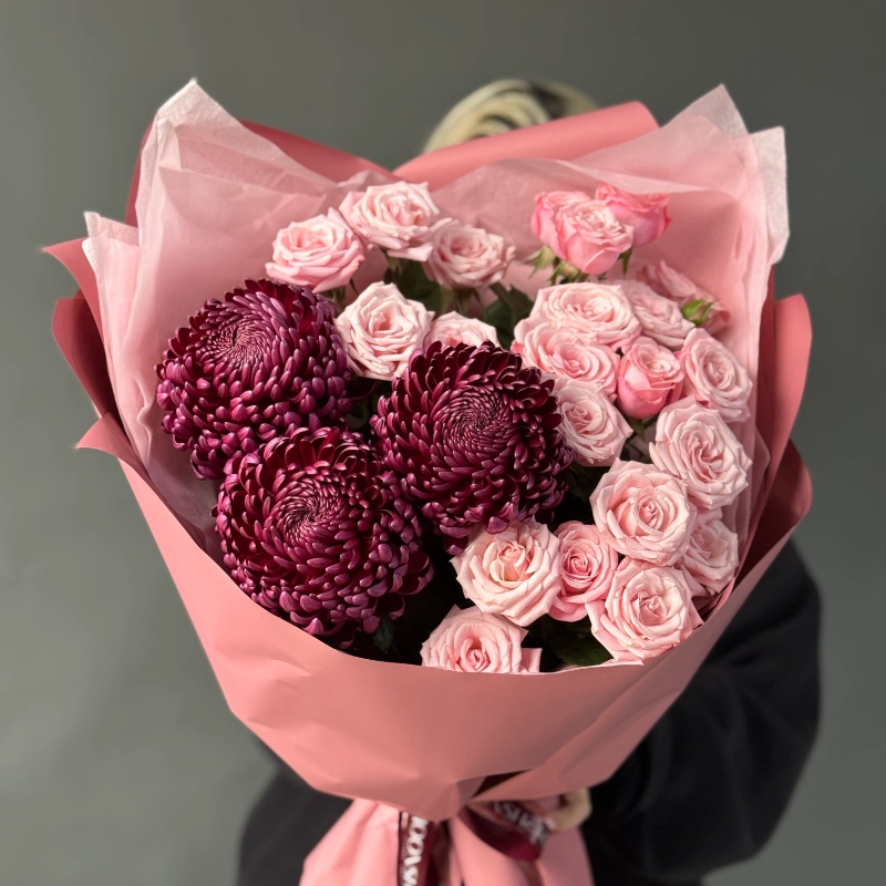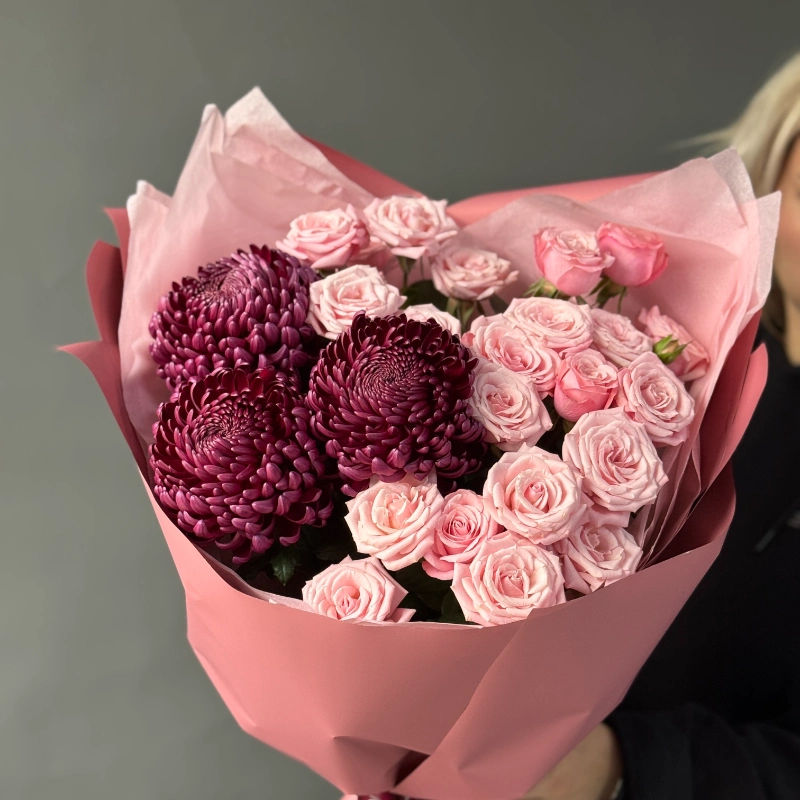 ГлавнаяКаталогСезонный букет с Хризантемой Бигуди и кустовыми розами