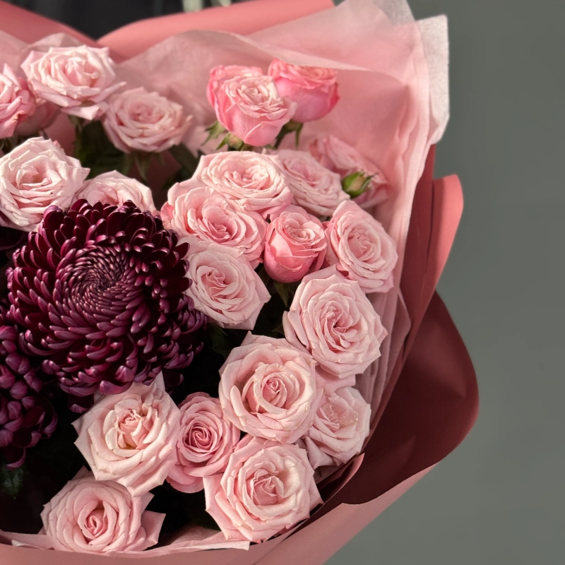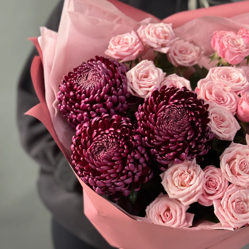 Сезонный букет с Хризантемой Бигуди и кустовыми розами