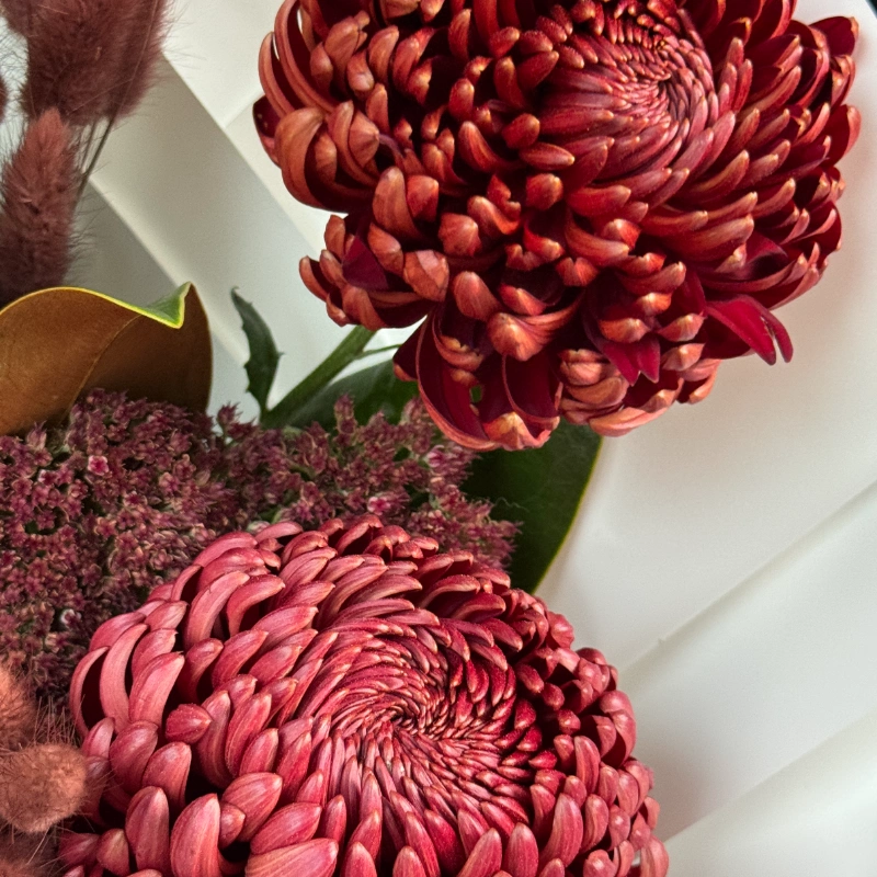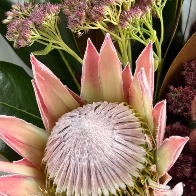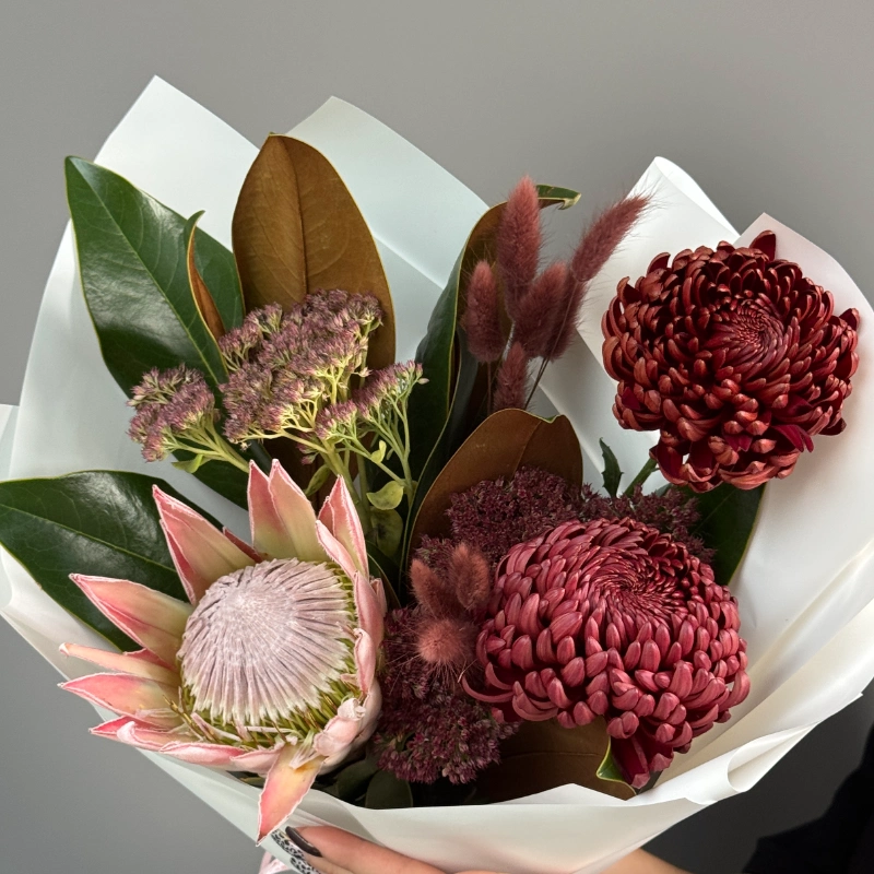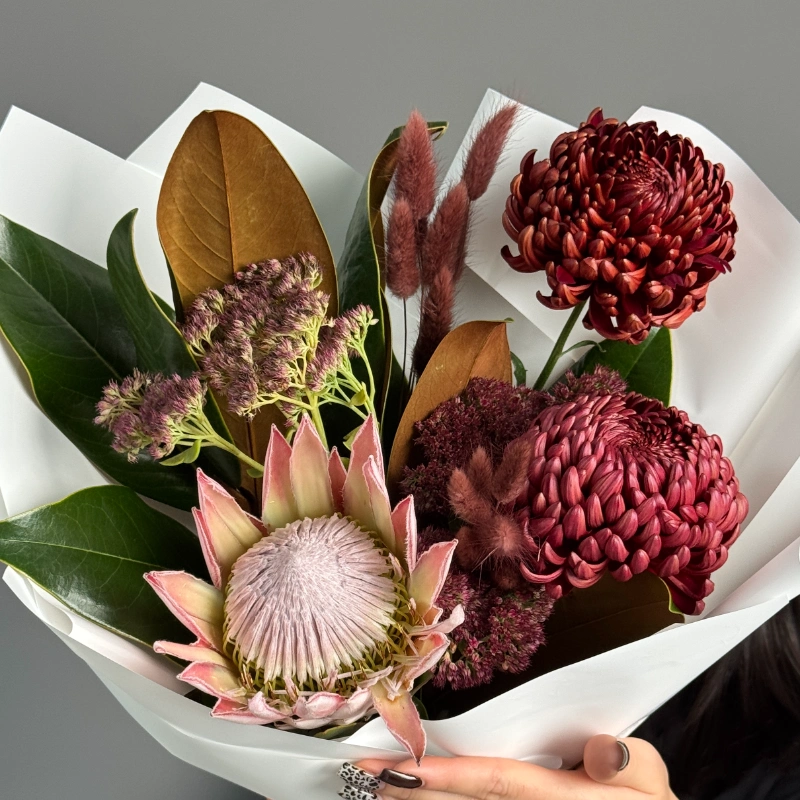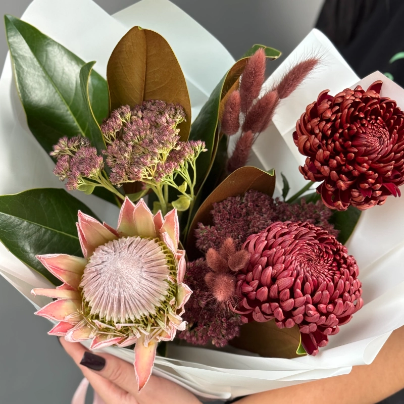 ГлавнаяКаталогЭкзотический букет с протеей и одноголовой хризантемой