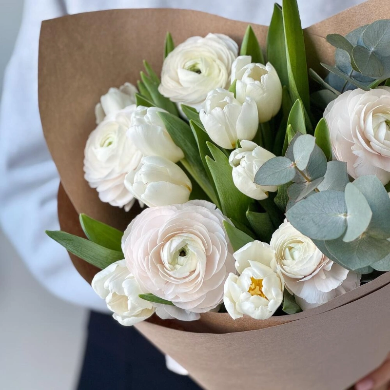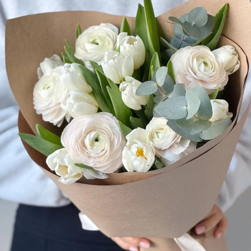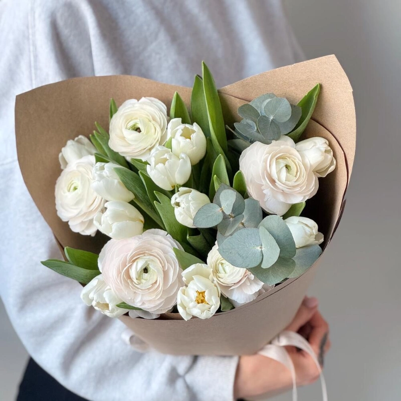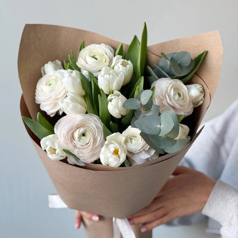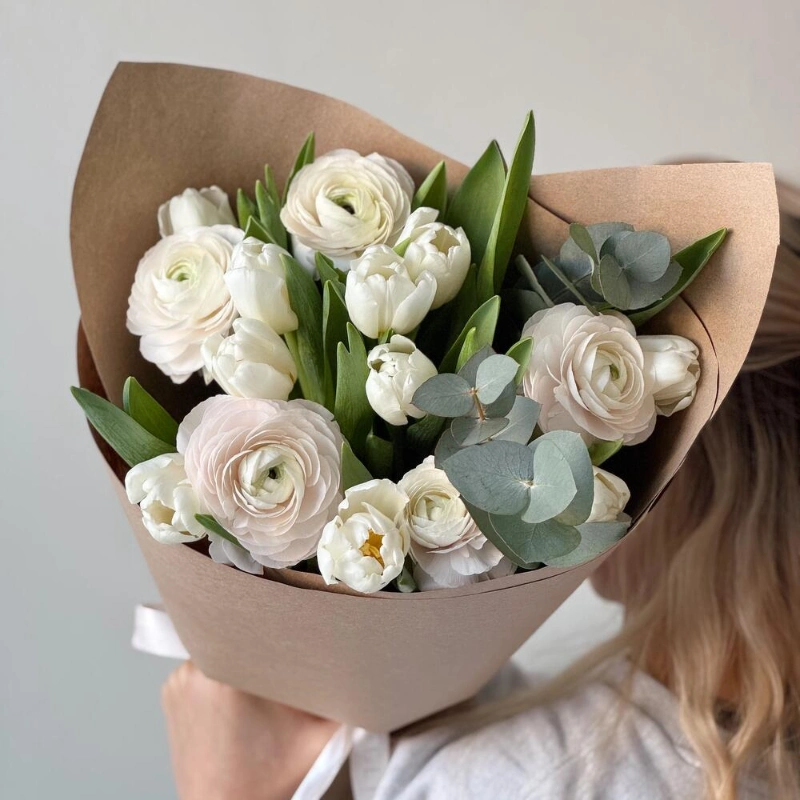 Букет с весенними нотами в стильной крафтовой упаковке. В составе роскошные тюльпаны и желанные ранункулюсы с эвкалиптом. Новая весенняя коллекция