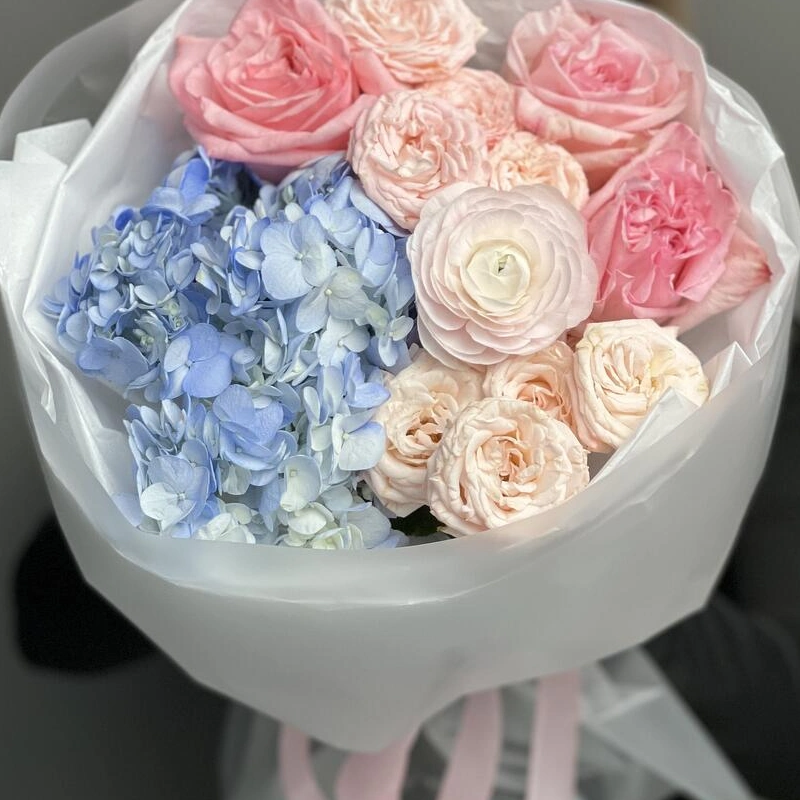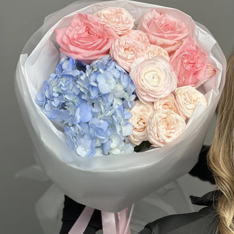 Нежный сборный букет для любимых ценителей нежных цветов. В составе эксклюзивный ранункулюс, ароматные розы, пышная гортензия и кустовые розы, самый любимый состав для ценителей.
