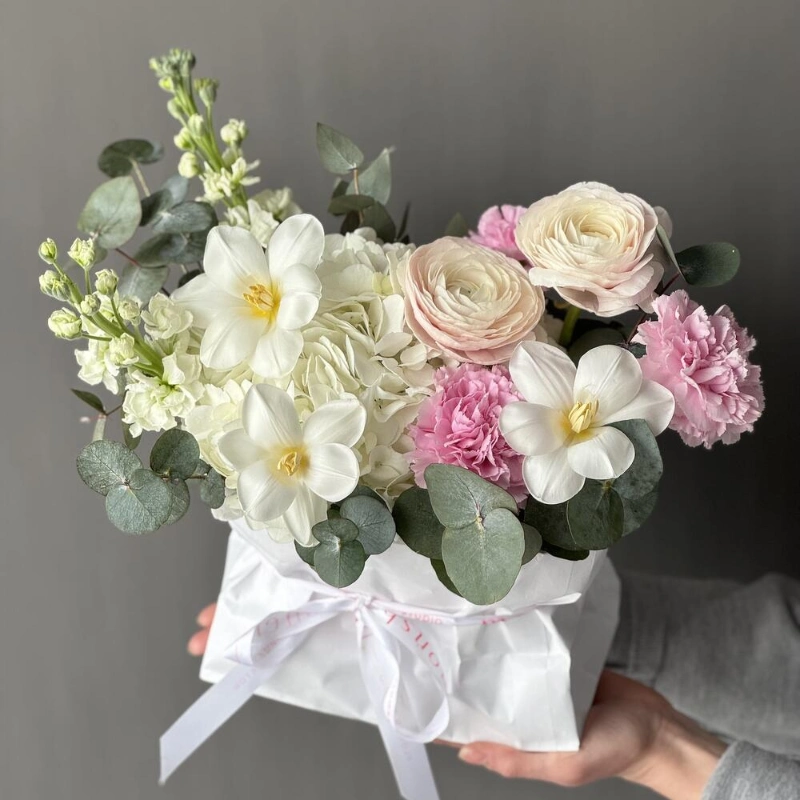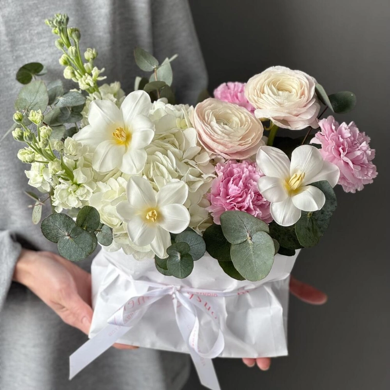 Авторская композиция «Ремингтон» французские тюльпаны, маттиола, ранункулюс, эвкалипт