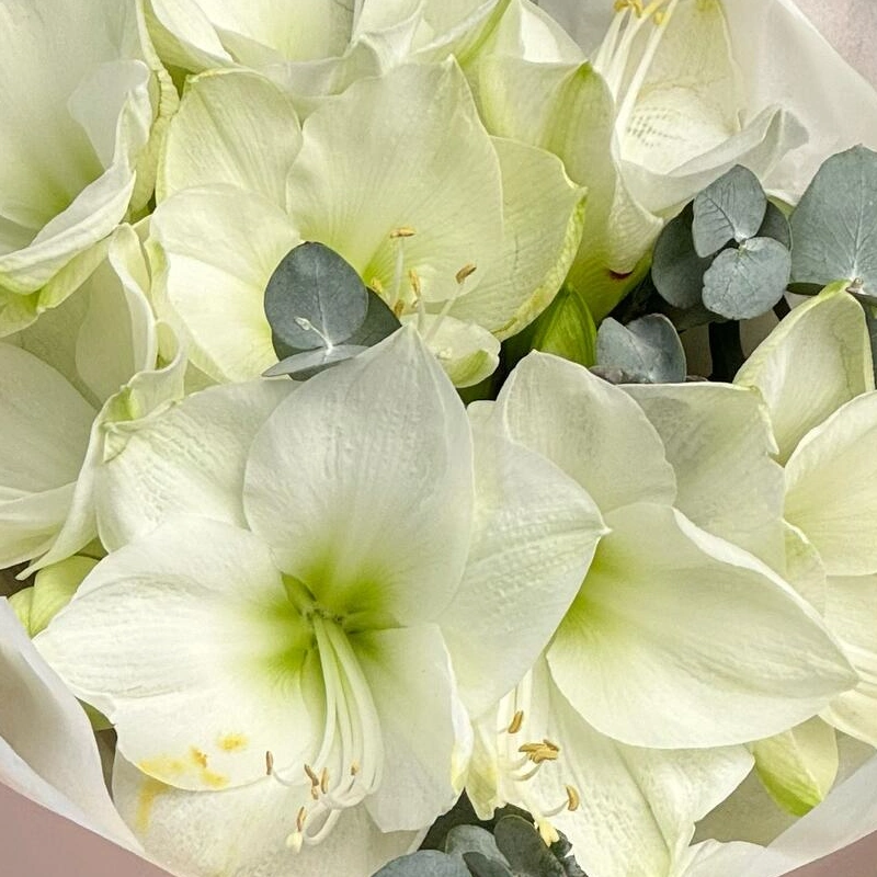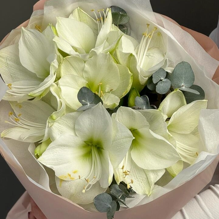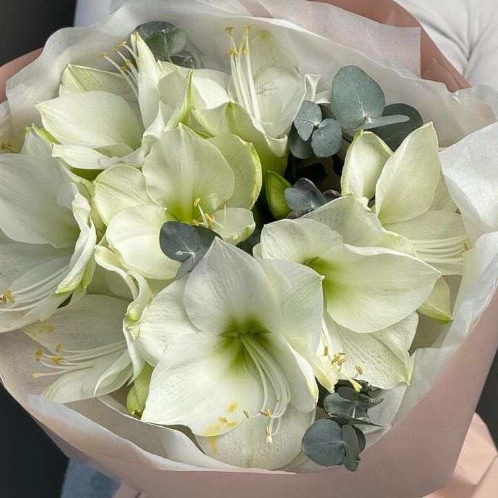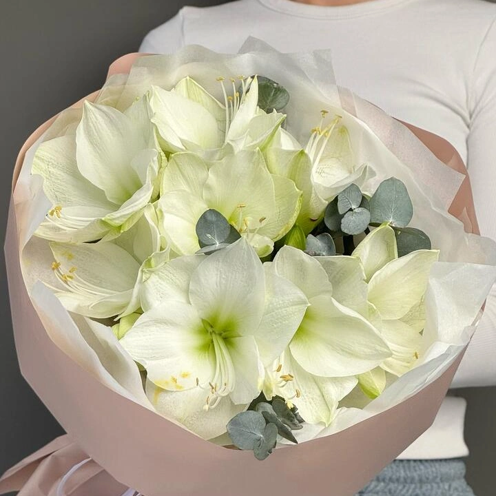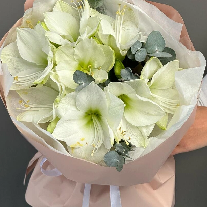 Моно букет из элегантных амариллисов - зимние, утонченные цветы для тонких чувственных натур. Стильная минималистичная упаковка и открытка с вашими пожеланиями