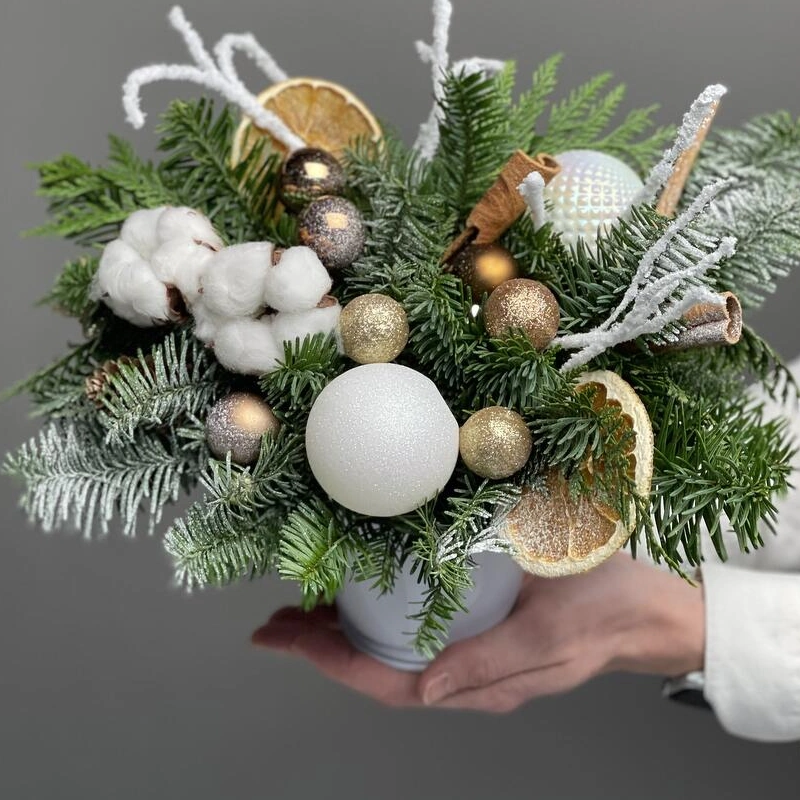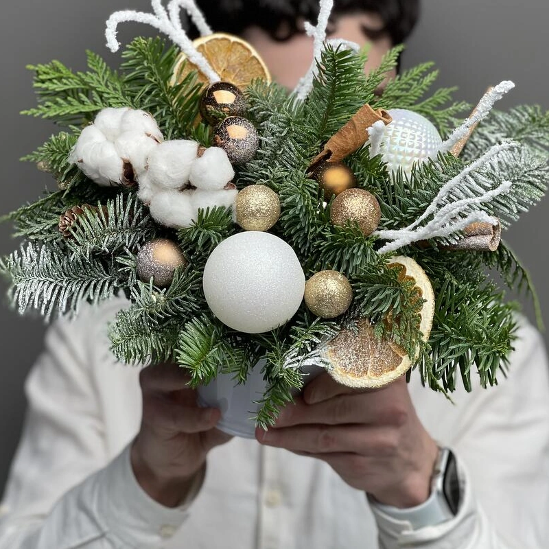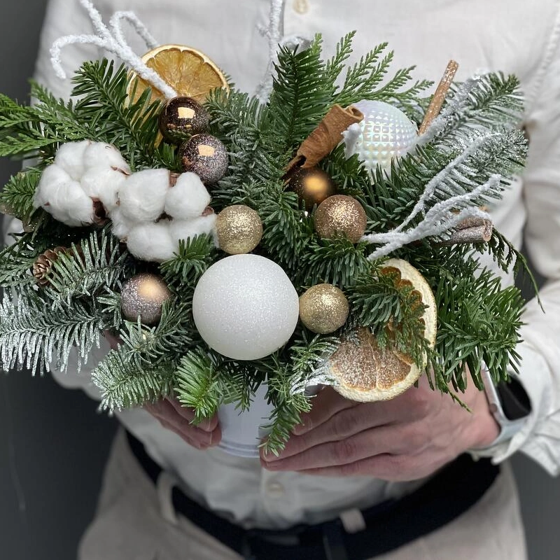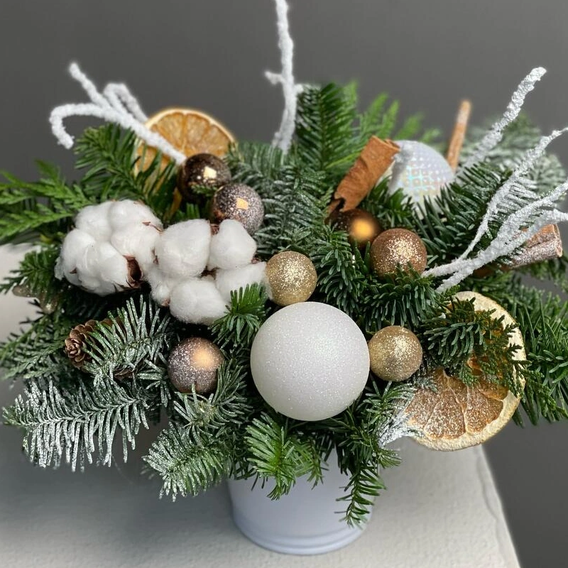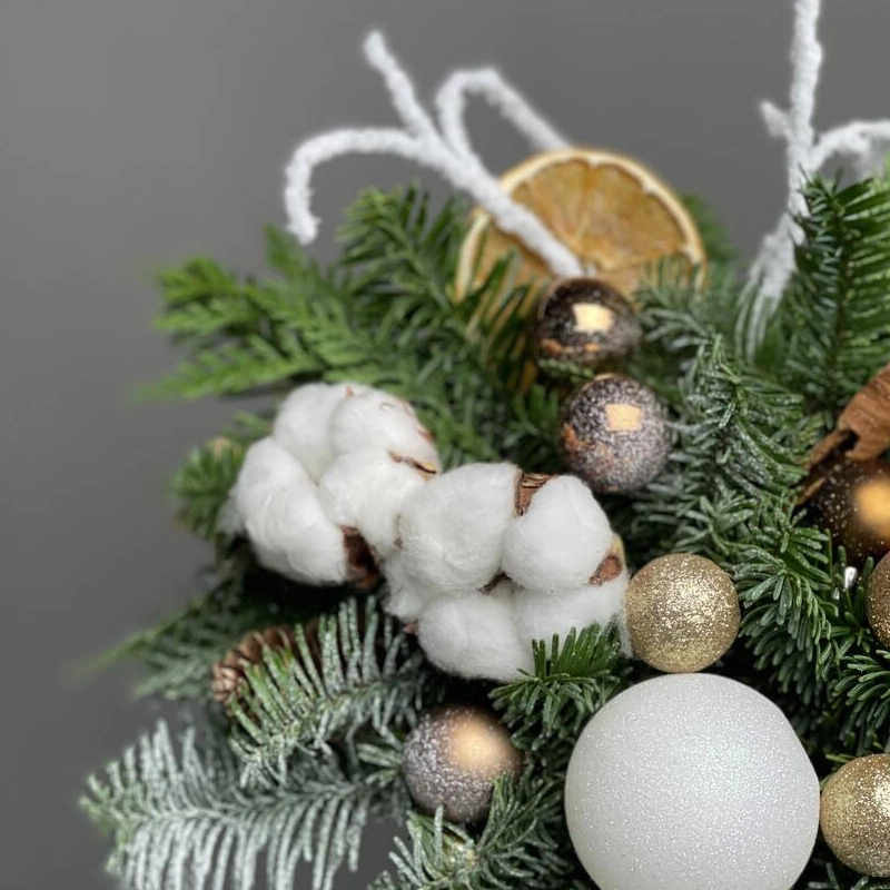 Композиция Новогодняя из датского нобилиса в сочетание с еловыми веточками, в дополнение композиции идут дольки апельсина, палочки корицы и ёлочные игрушки🎄