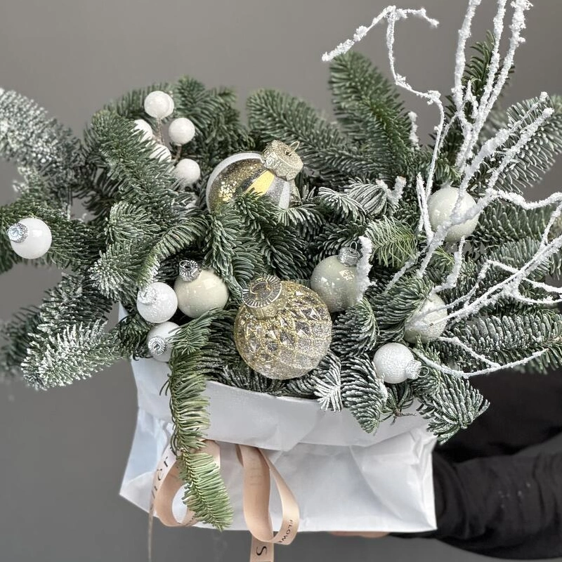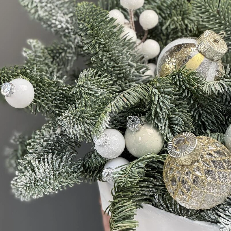 Необычайной красоты новогодняя композиция с еловыми ветками нобилиса, игрушками, и белоснежными веточками