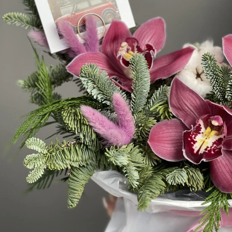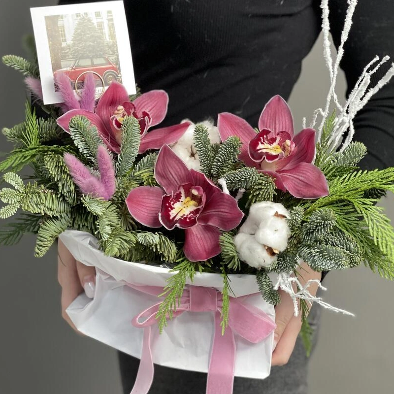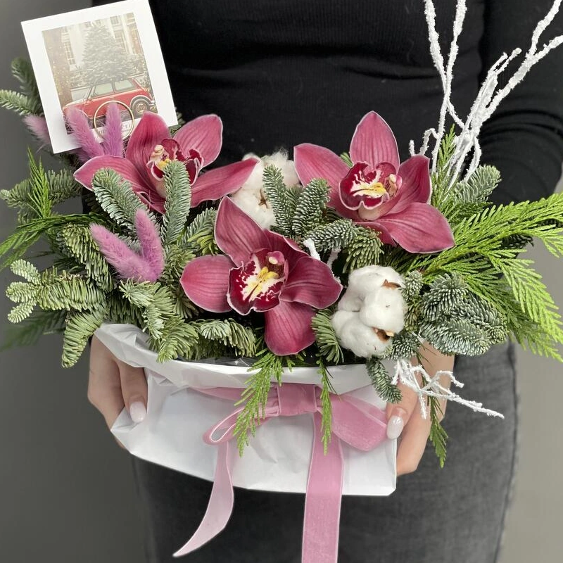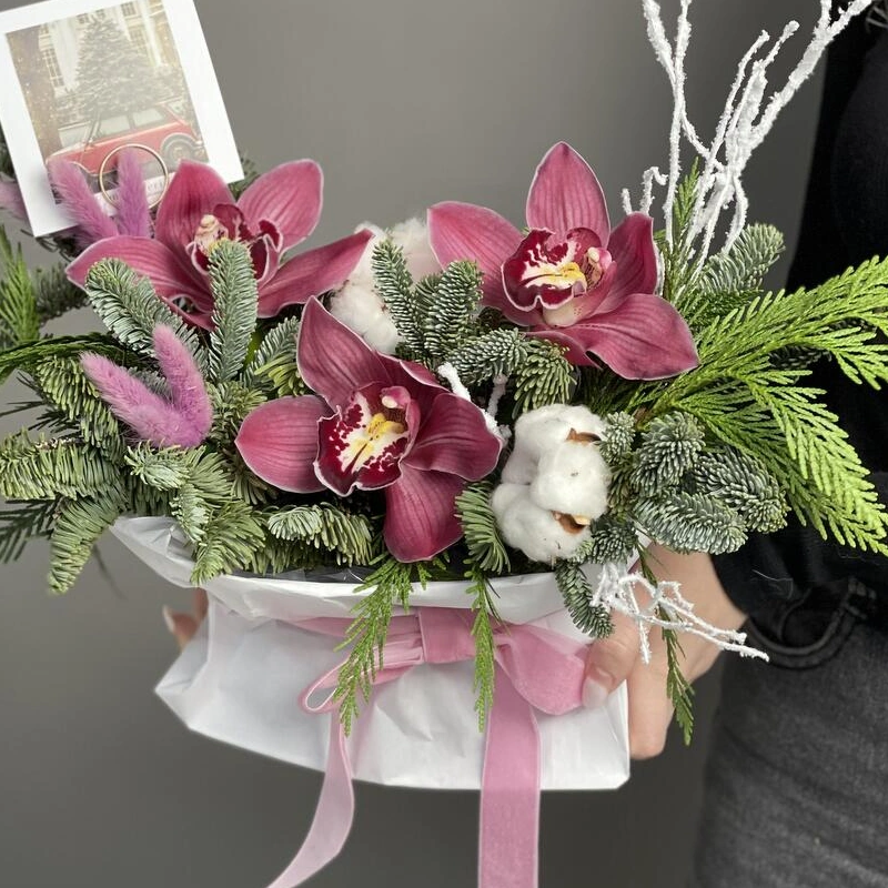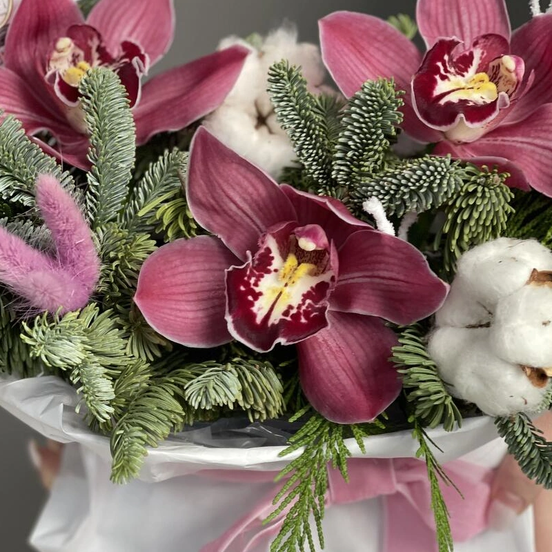 Композиция из нобилиса с добавлением орхидей станет незаменимым украшением для вашего дома, а так же окажется идеальным подарком