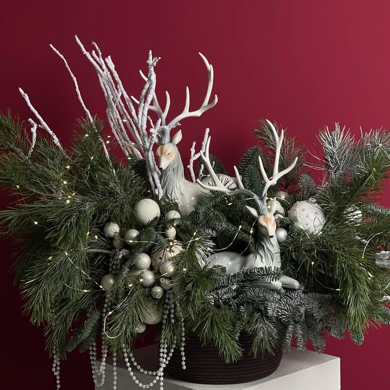 Авторская новогодняя композиция из нобилиса с бордовыми игрушками