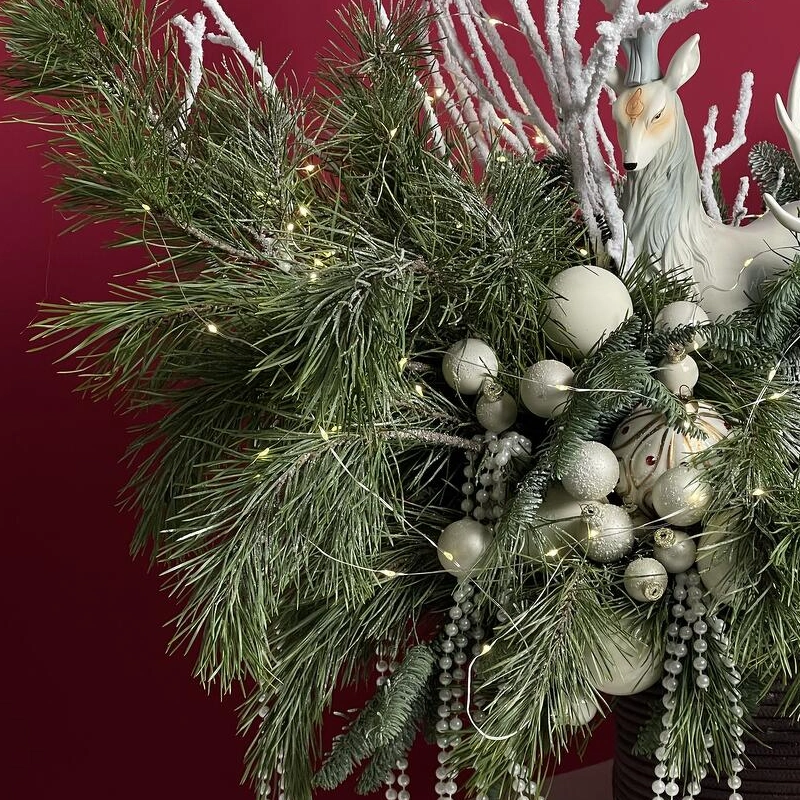 Новогодняя композиция из веток нобилиса с елочными игрушками