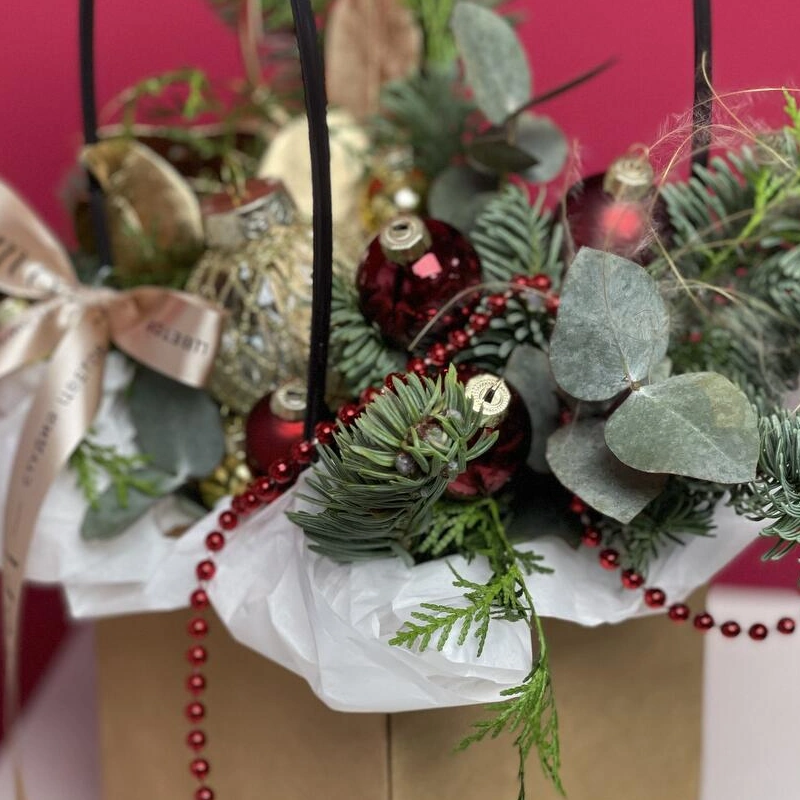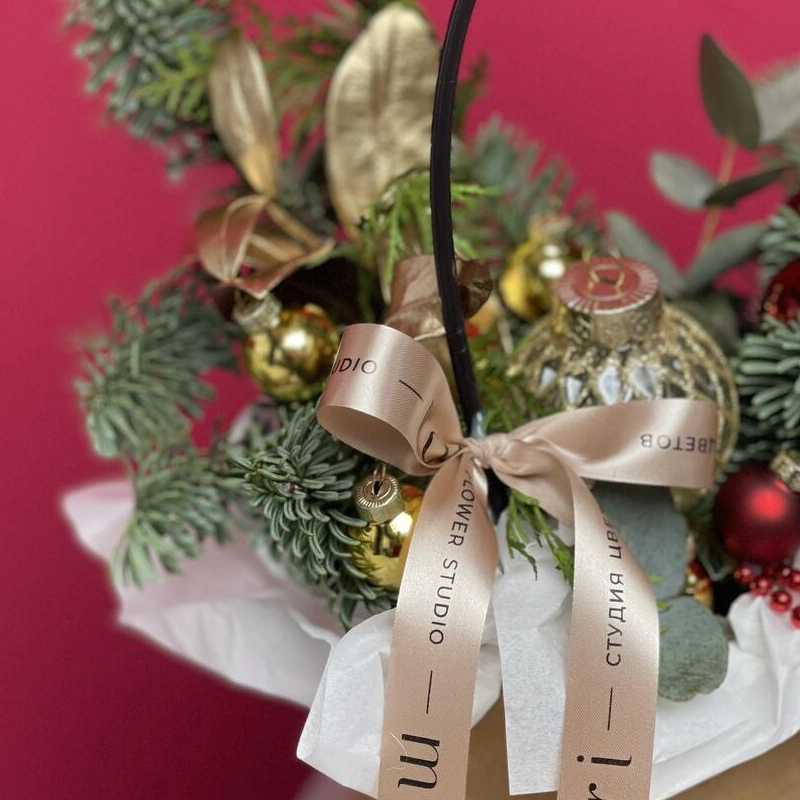 Новогодняя композиция из датского нобилиса в праздничными игрушками