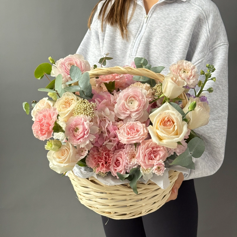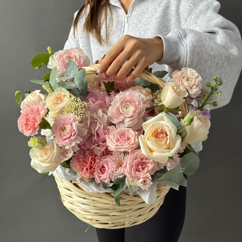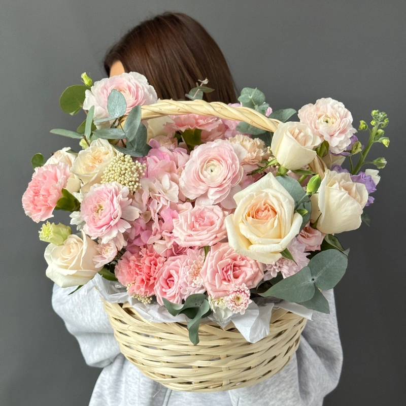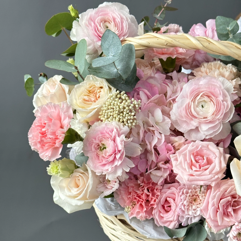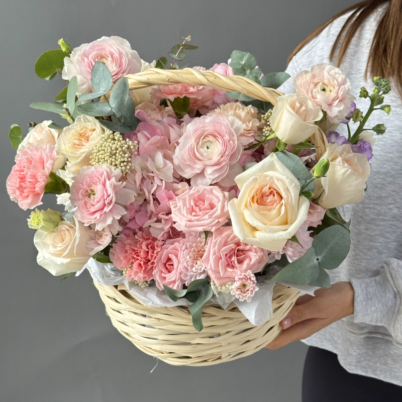 ГлавнаяКаталог«Теплая осень» Ранункулюсы, пионовидные розы и гортензия в корзине