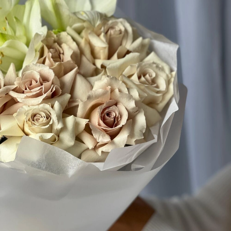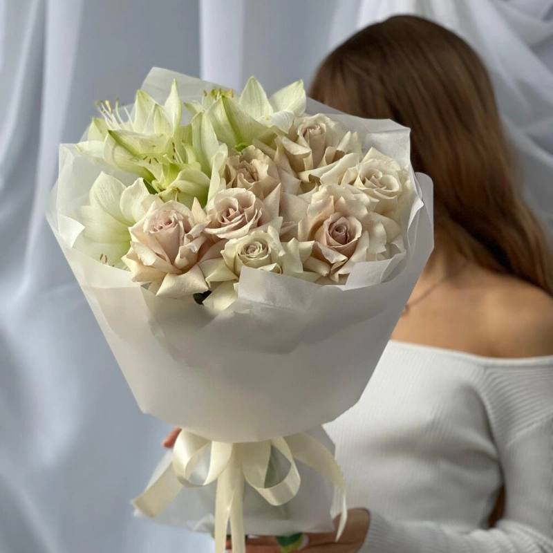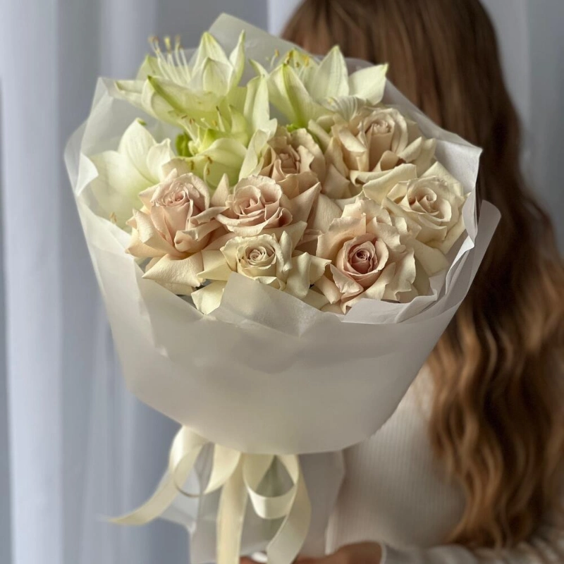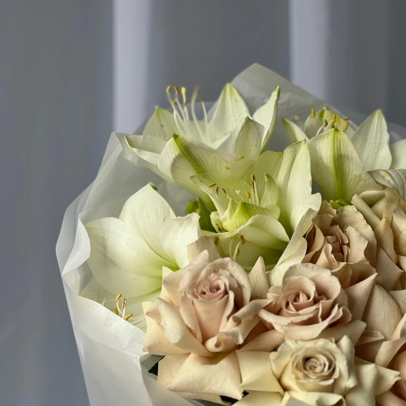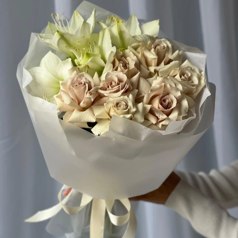Этот изысканный букет содержит великолепные розы и амариллисы, создавая гармоничное сочетание классической красоты и элегантности. Яркие и насыщенные цвета цветов придают подарку свежий и радостный вид. Каждый цветок выбран с заботой для идеальной композиции и долговечности. Такой букет идеально подойдет для особых случаев, чтобы выразить теплые чувства и уважение. Высокое качество материалов гарантирует сохранить свежесть и красоту цветов на долгое время. Подарите себе или близким кусочек природы и женственности с этим изящным сочетанием цветов.
