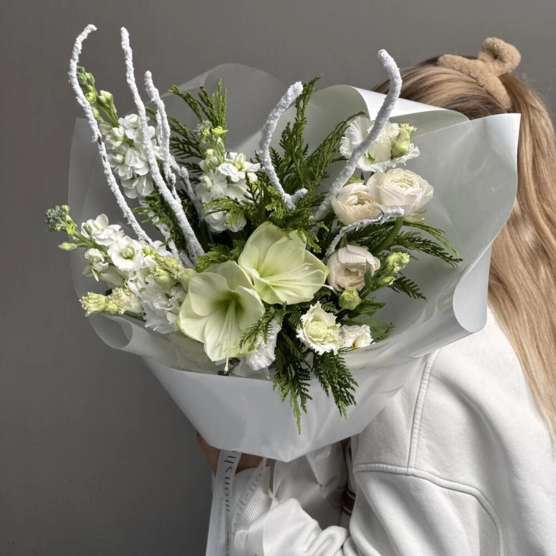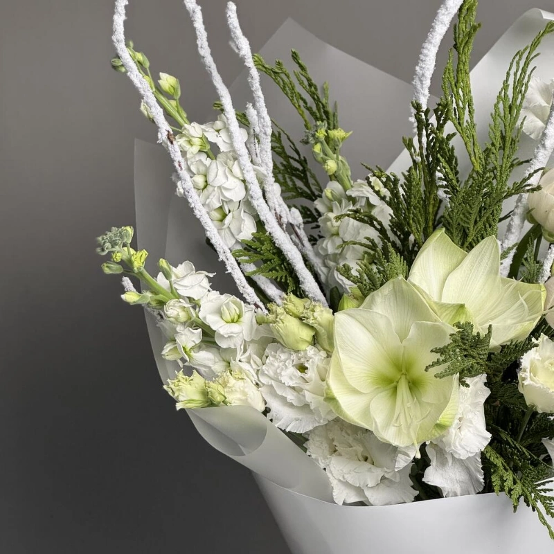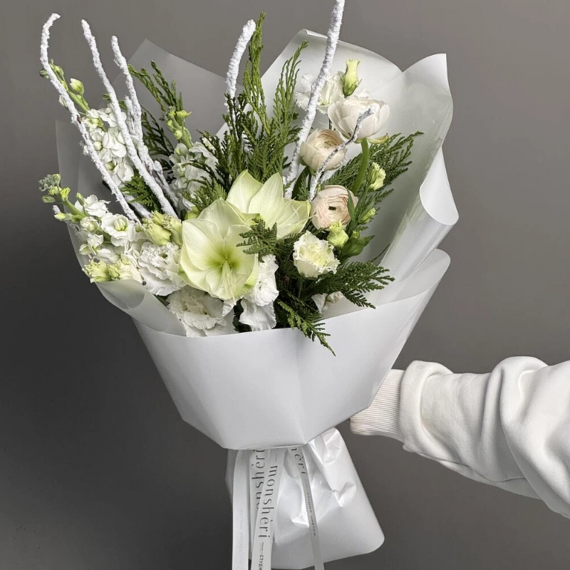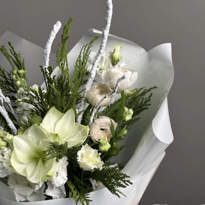 Создайте праздничное настроение с нашим зимним букетом, который прекрасно сочетает в себе яркие Амариллисы и свежие еловые веточки. В составе – изысканные Ранункулюс, утончённая Эустома и нежная Маттиола, дополняющие композицию. Этот букет идеально подойдет для украшения вашего дома и создания уюта в холодные зимние дни. Подарите красоту природы и ощущение праздника с нашим зимним букетом!