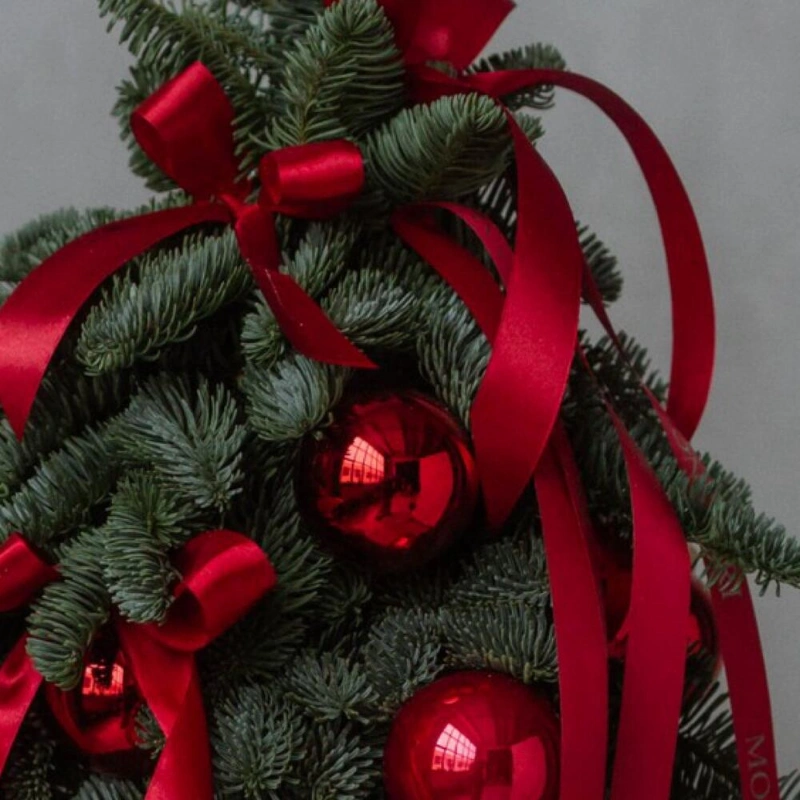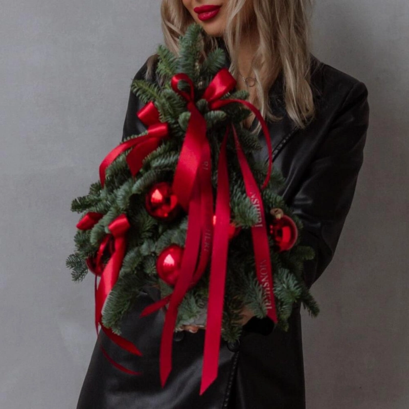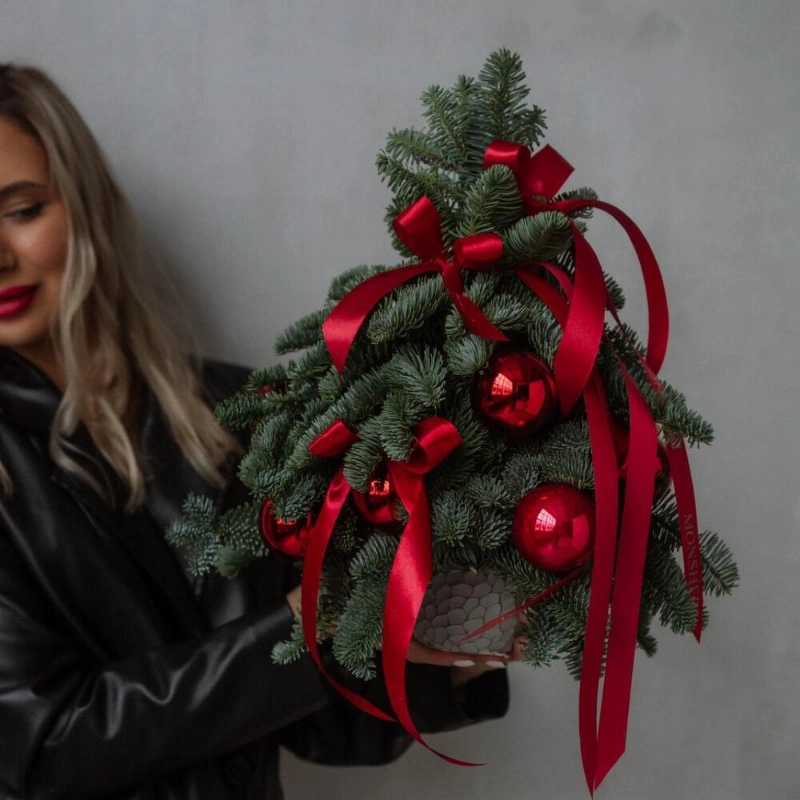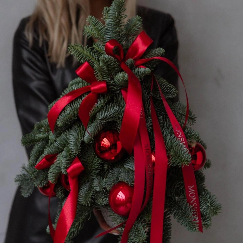 Авторская новогодняя композиция из нобилиса с бордовыми игрушками