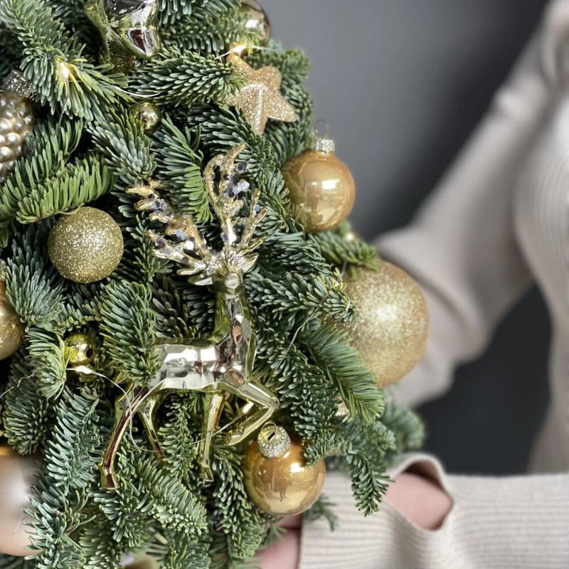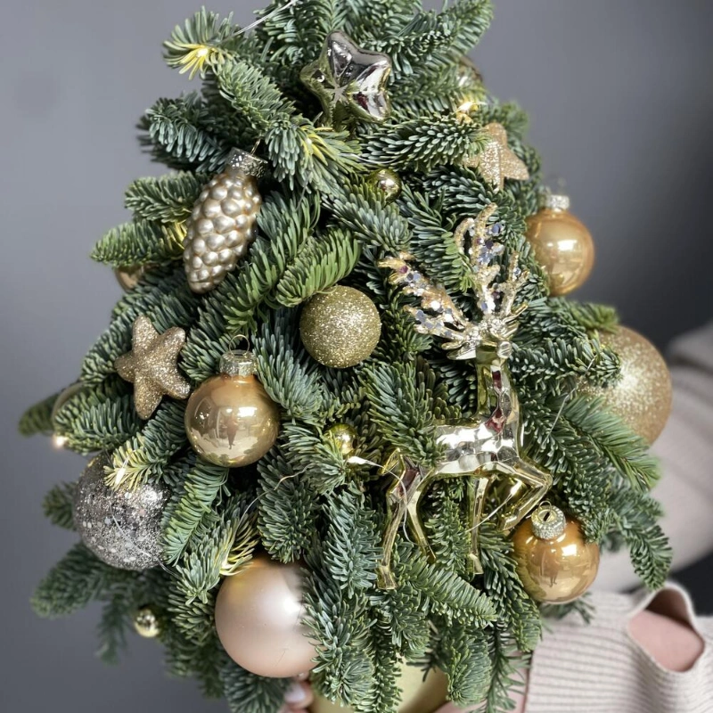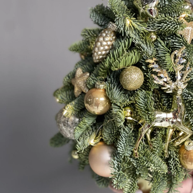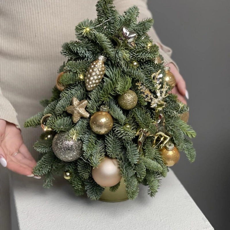 Эта элегантная ёлочная композиция ручной работы станет изюминкой вашего новогоднего интерьера. В её составе - нежная игрушка, создающая атмосферу праздника и уюта, а также свежий нобилис, придающий композиции натуральную красоту и аромат. Каждый элемент тщательно подобран и выполнен с любовью, что делает каждую композицию уникальной. Благодаря своему оригинальному дизайну, она отлично впишется в любой стиль декора. Идеальный подарок для близких и друзей, ценящих ручную работу и эстетику. Создайте неповторимую праздничную атмосферу, украшив дом этой прекрасной композицией. Натуральные материалы гарантируют долговечность и экологичность. Позвольте себе немного волшебства и уютного тепла в новогоднюю ночь!